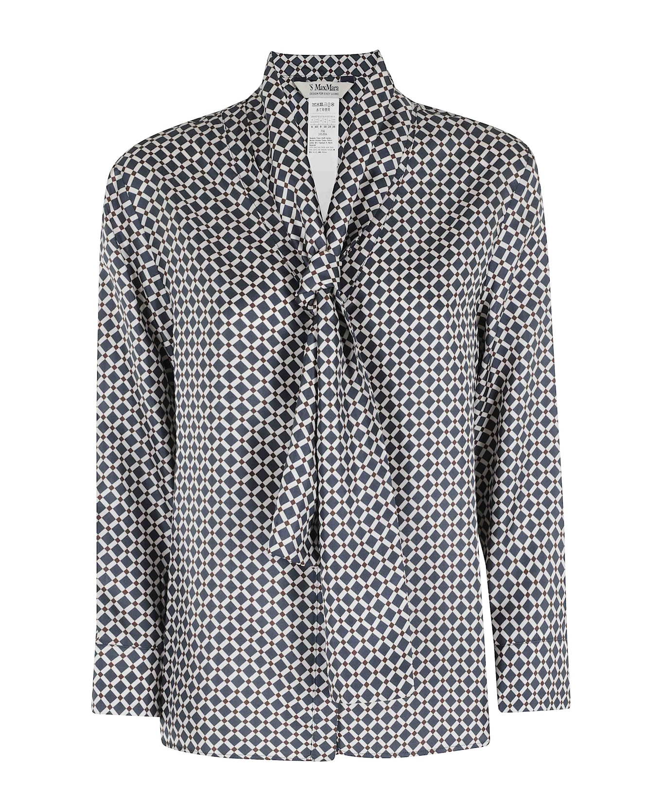 Category: Tops Item: Blouse victory Brand: S Max Mara Color: Midnight blue Neckline: V-neck Details: all-over print, ribbon on the neckline Closure: Button closure SIZE AND FIT Fit: Regular Sleeve: Long