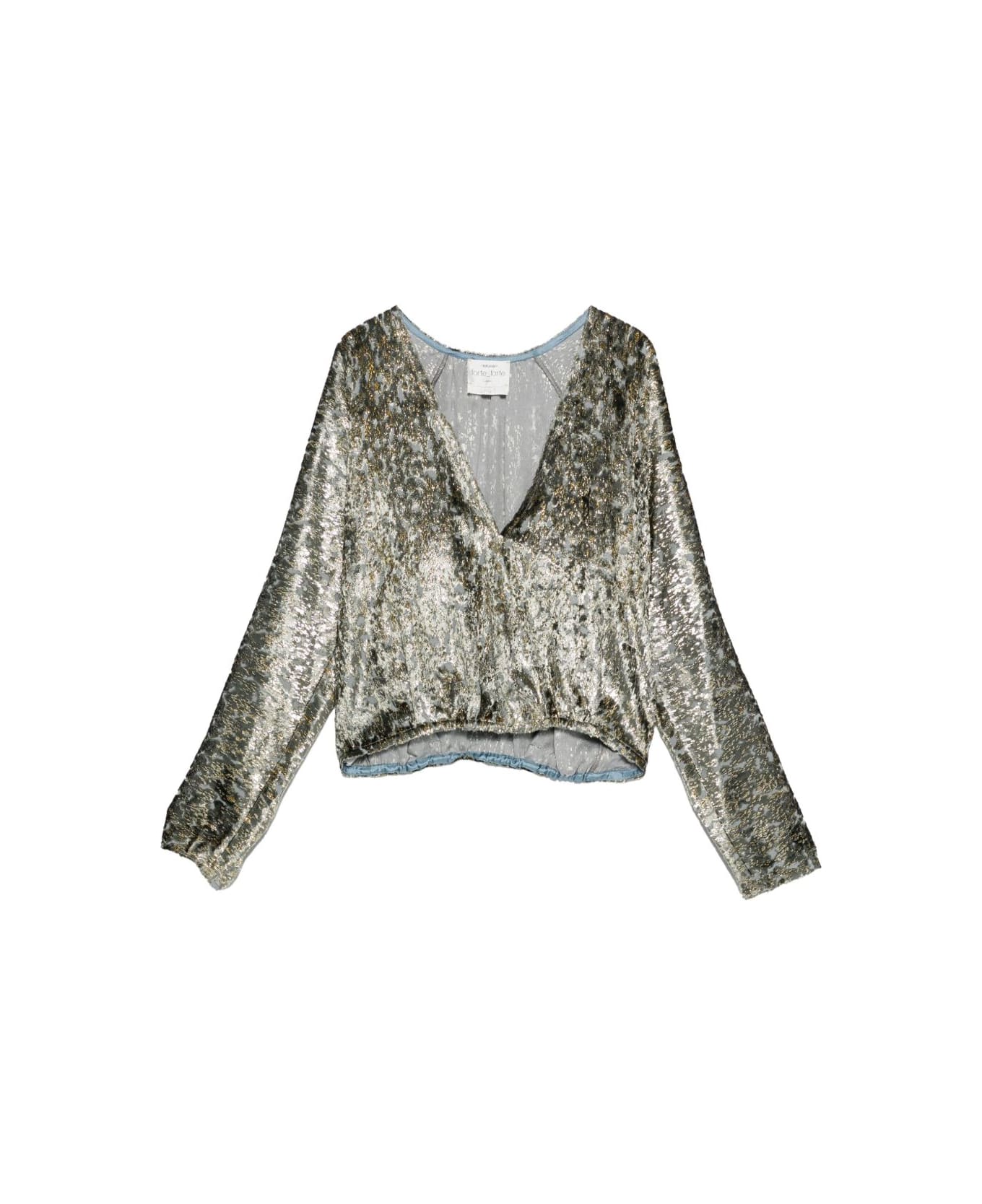 silver metallic effect V-neck long sleeves crossed front elasticated hem
