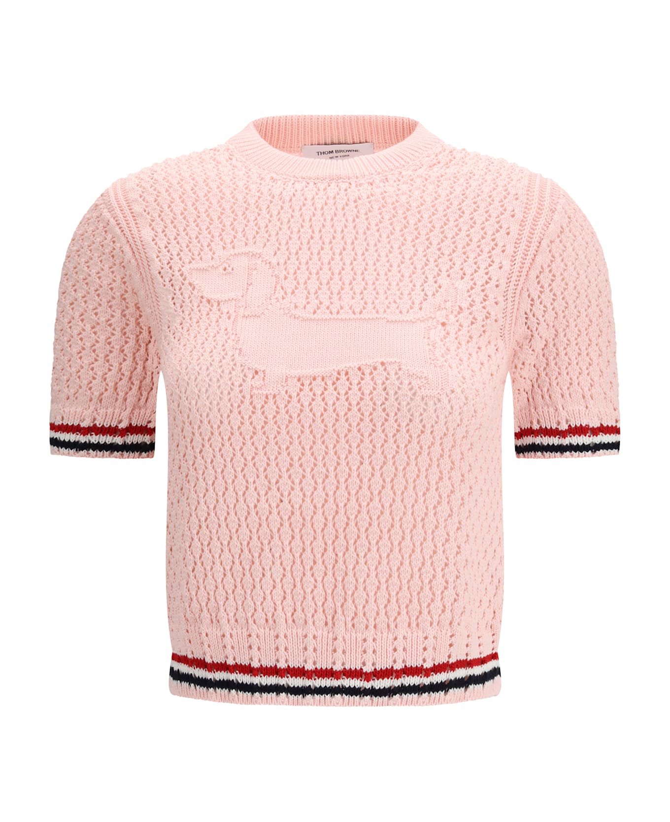 The hector t-shirt by thom browne features an elegant pointelle stitch construction showcasing the iconic hector dog motif. designed with a crew neck, short sleeves, and signature striped detailing, it blends refined craftsmanship with the brand s unmistakable aesthetic. Composition: 100% % Cotton