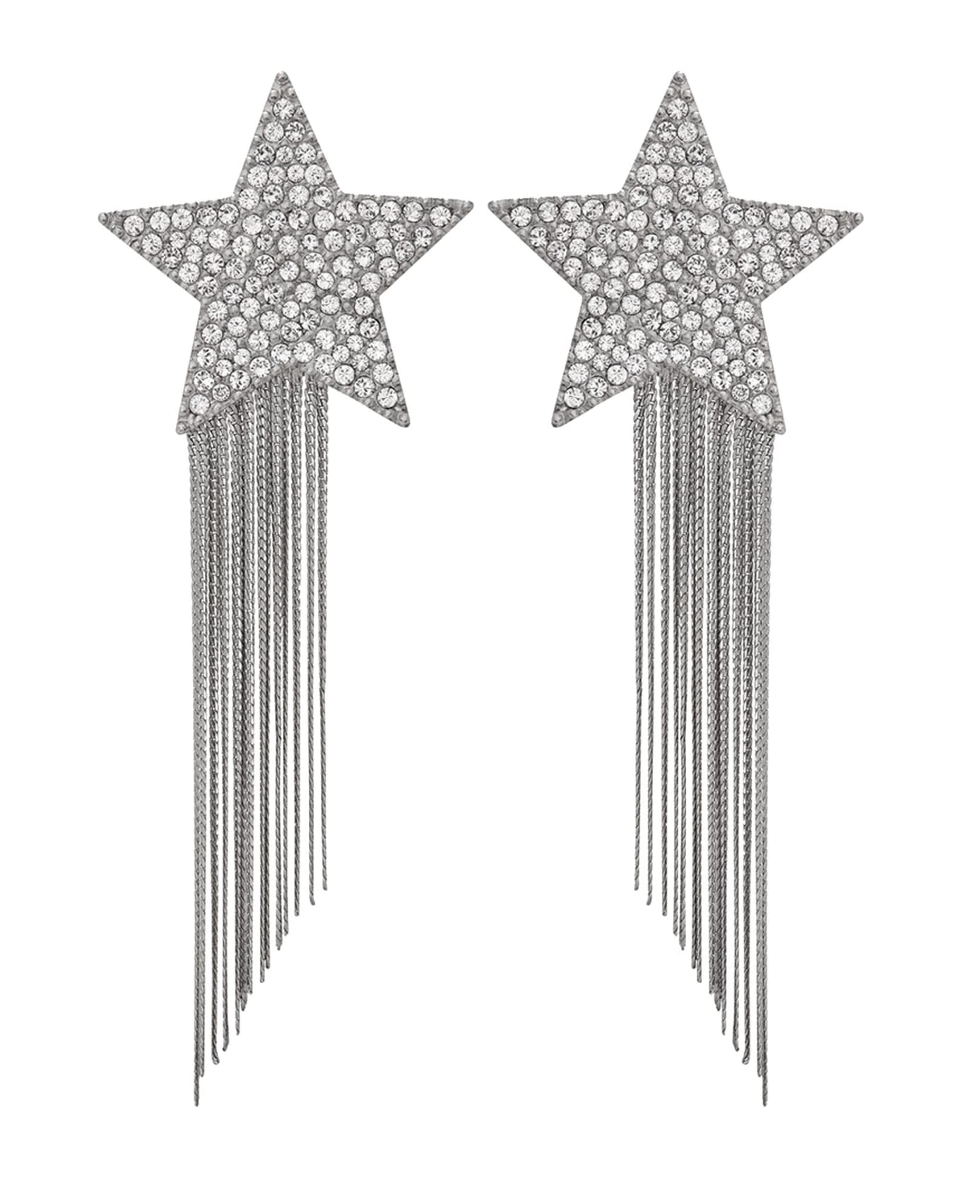 Sparkle, elegance and modernity come together in the Stars & Love earrings by Saint Laurent. The light is refracted on the multitude of crystals that cover the star-shaped brass base. Silver metal wires, like light trails, stretch towards the neck, to be discovered by gathering the hair.