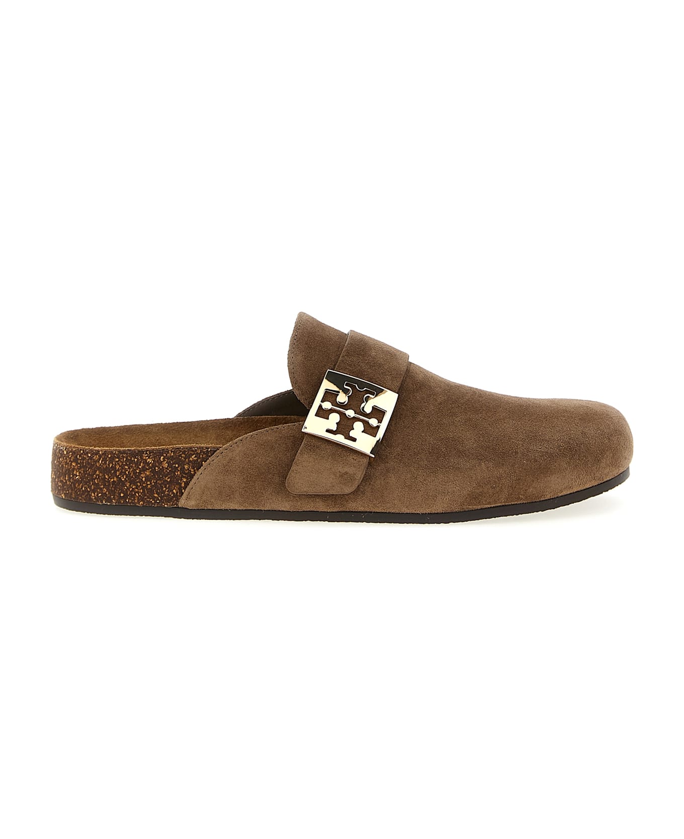 'Mellow' suede mules, gold metal logo strap, suede coated cork insole, flexible rubber sole.