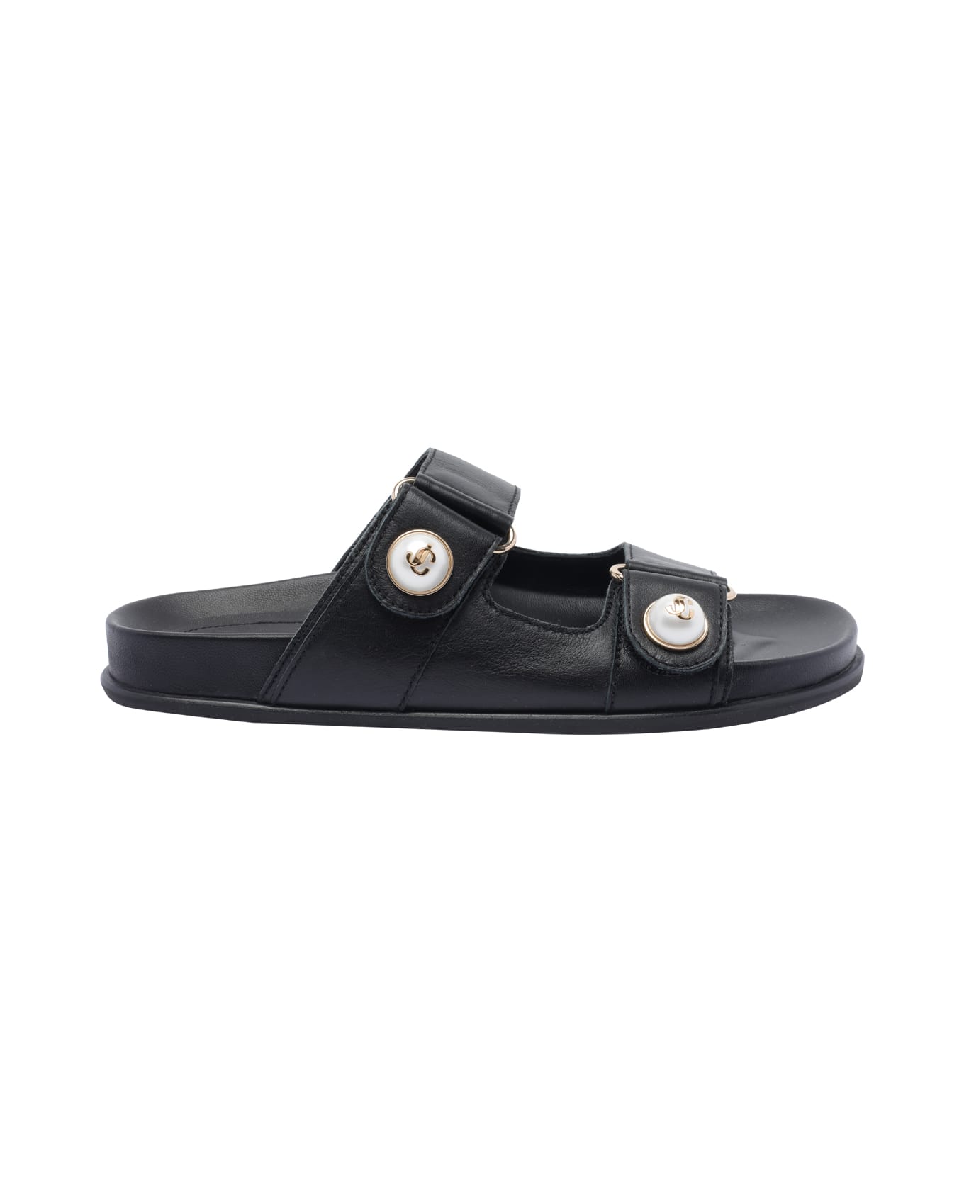 Jimmy Choo black Fayence sandals, leather upper, pearls logo detail, open round toe, buckle closure Composition: 100% Calf Leather/rubber Sole