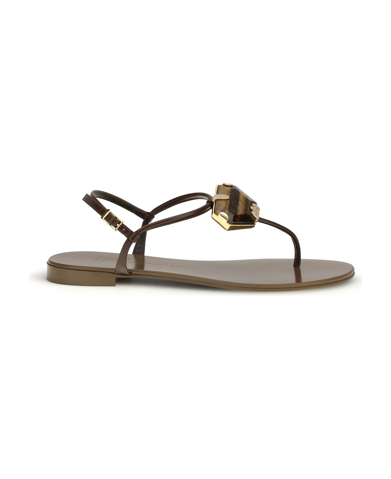 The pia muse sandals by giuseppe zanotti are flat leather thongs featuring a maxi stone detail that adds a touch of elegance. the adjustable strap with metal buckle ensures a perfect fit, while the leather-covered insole offers comfort and style in every step. a sophisticated design that combines sophistication and practicality.