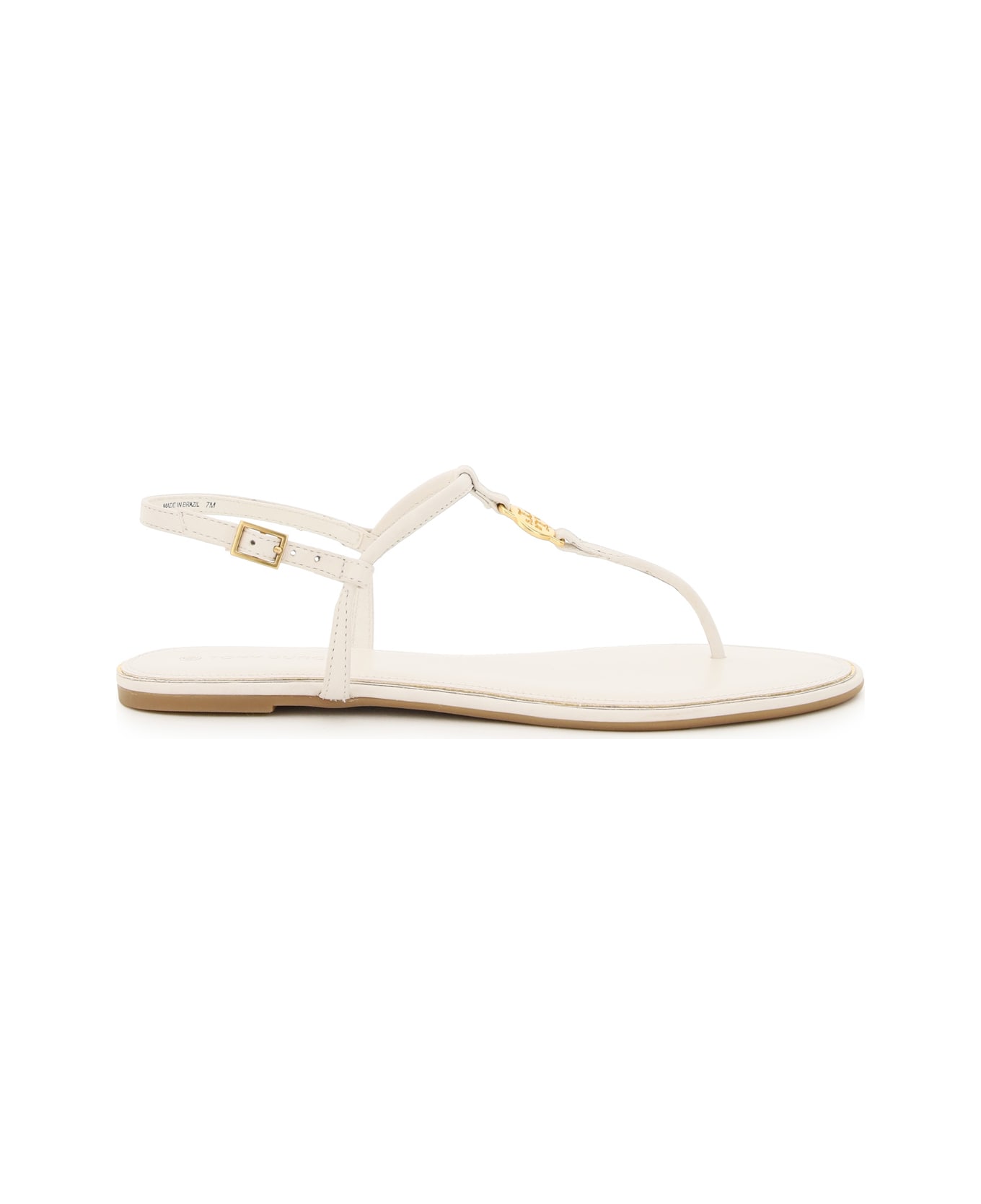 Emmy flat thong sandals in soft leather by Tory Burch, enriched by a small gold-tone metal double T logo medal. Buckled back strap, leather footbed with gold-tone trim, rubber sole.