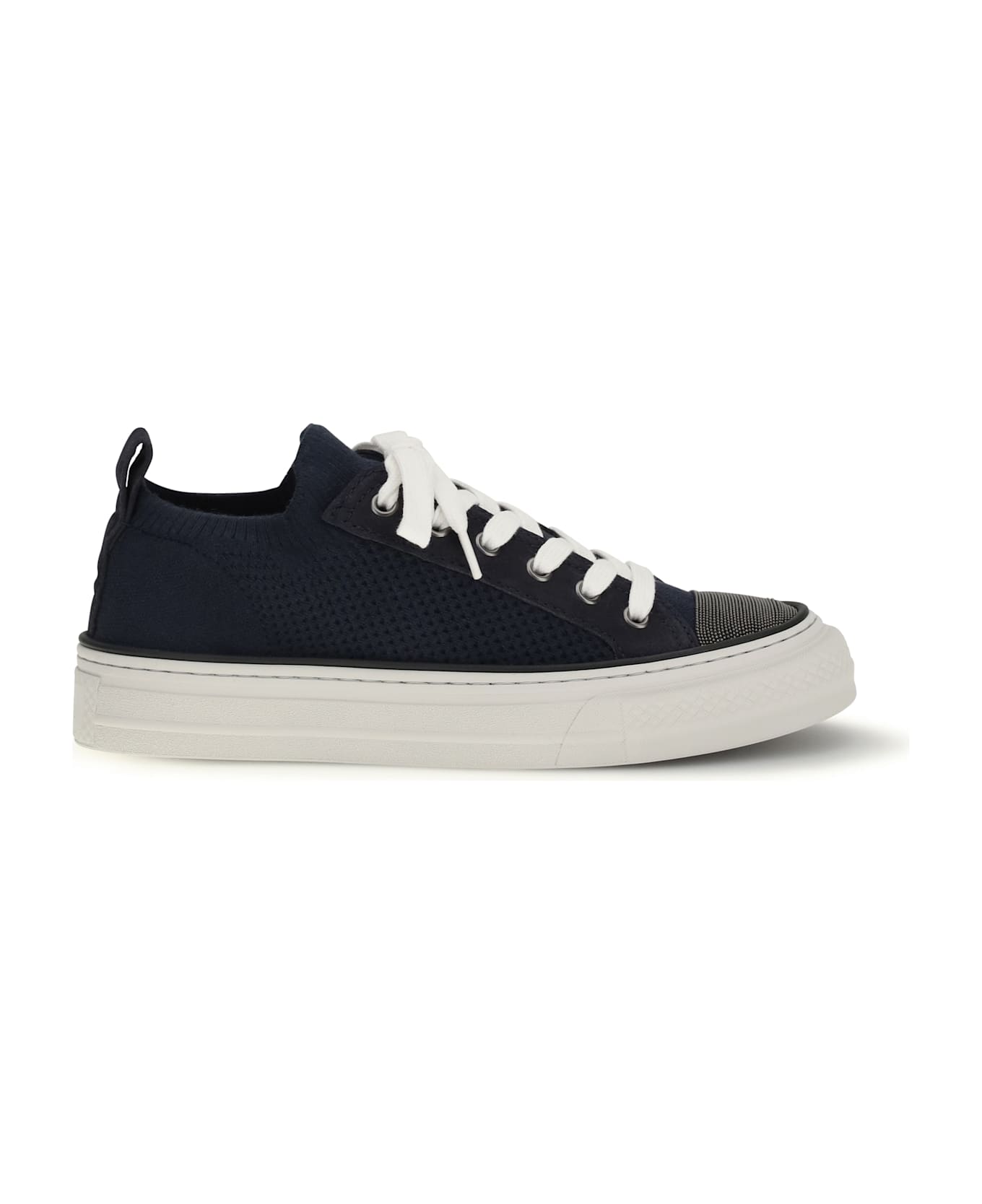 The cotton knit and suede sneakers by brunello cucinelli are the perfect blend of elegance and comfort. the round toe is embellished with iconic shiny jewels, adding a touch of luxury to the sporty design. suede details lend a sophisticated look, while the front lace-up closure ensures a secure and adjustable fit. the flat sole offers all-day comfort, while the branded insole completes the look with a distinctive detail.