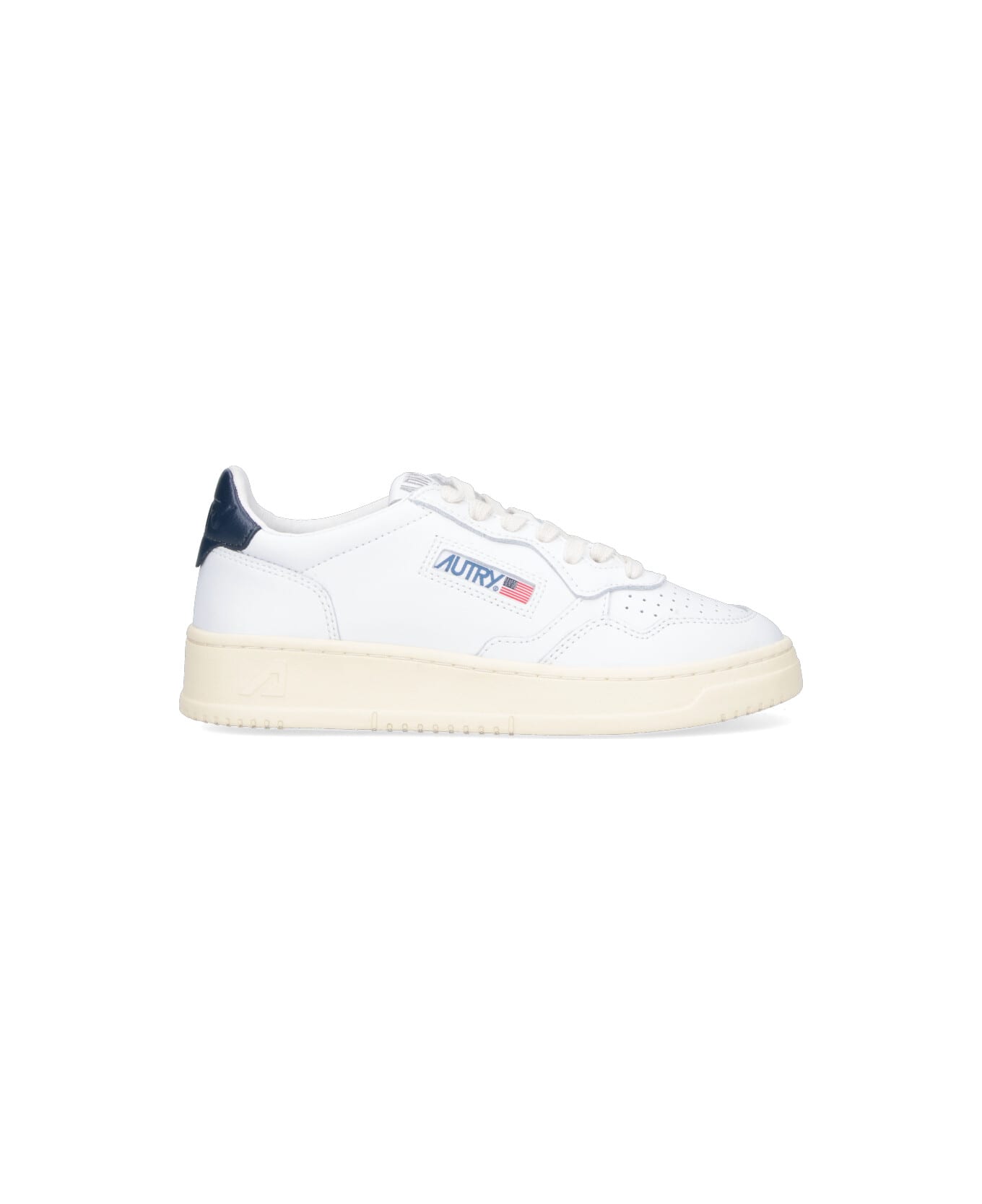 Autry Low "Medalist 01" sneakers in white leather with perforated round toe, laces, logo label tab, blue logo embroidery on the side, black back tab, cream rubber sole.
