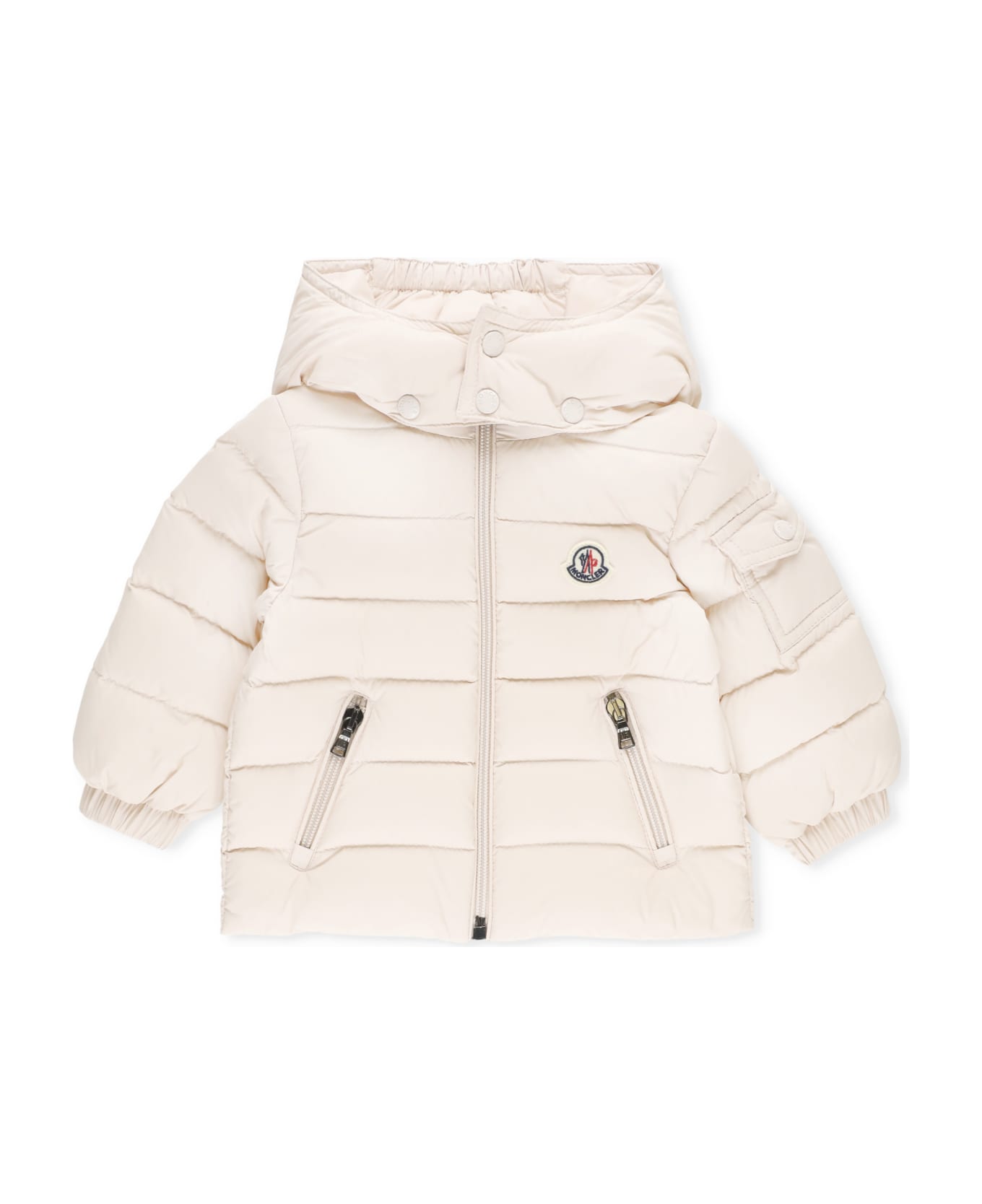 - Pink Moncler Baby down jacket for boy - Removable hood with snap buttons - Long sleeves with elastic at hem - Front contrasting color logoed patch - Two side pockets with zip - Front zip fastening