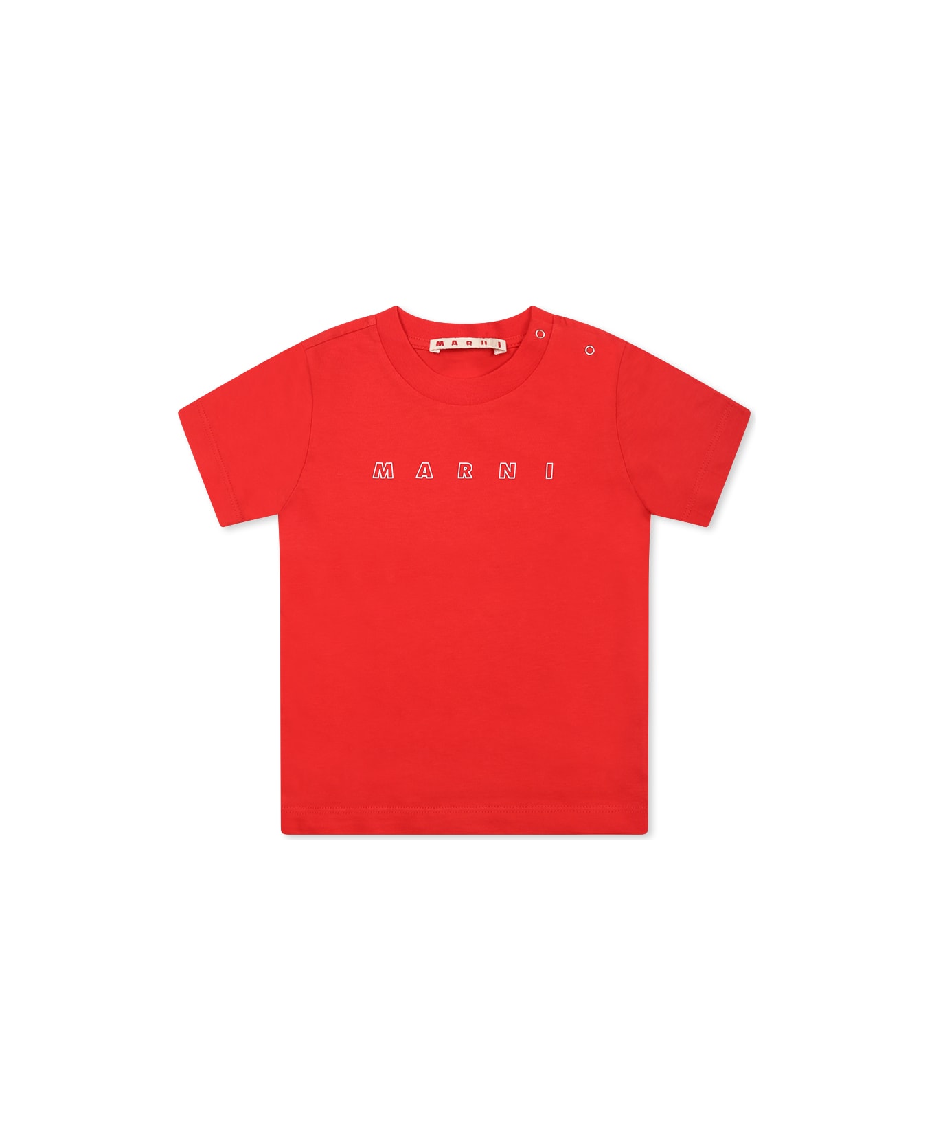 Red cotton t-shirt, short sleeves, with ribbed crew neck and snap button closure on the shoulder. It is embellished with Marni logo printed on the front.
