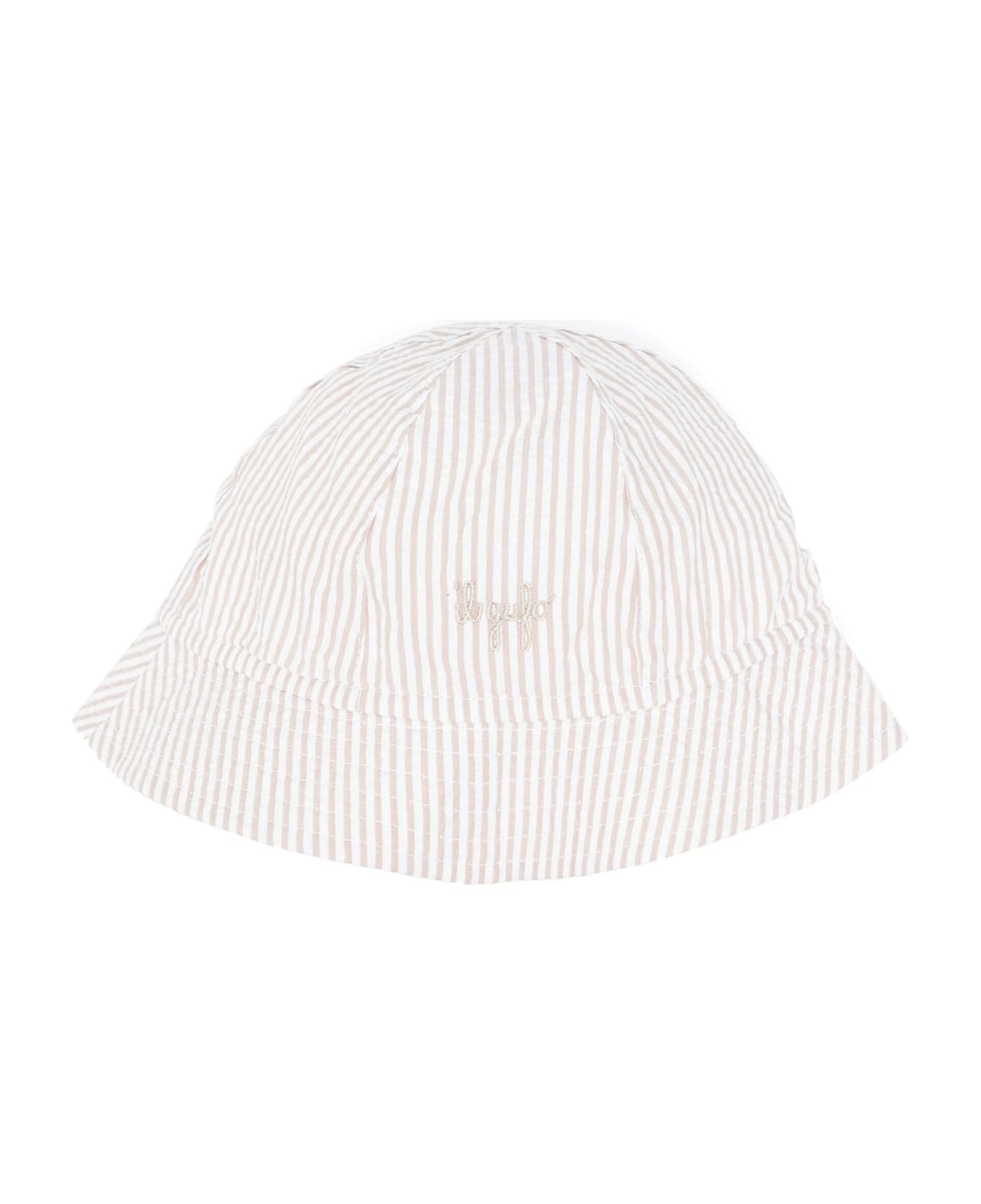 Il Gufo hat for babies made of white and beige striped seersucker with embroidered logo.