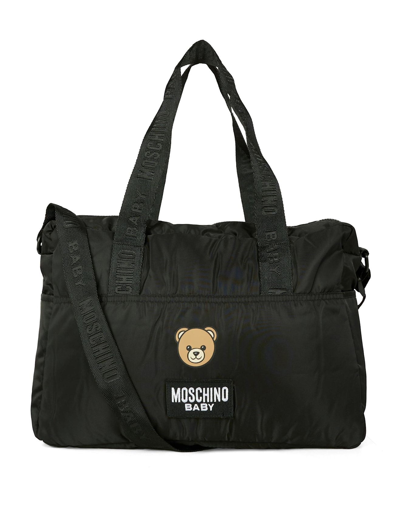 Black Moschino Kids changing bag with logo handles, top zip closure, adjustable shoulder strap, side pockets, and an internal changing mat. It is embellished with a Teddy Bear print and logo patch on the front.