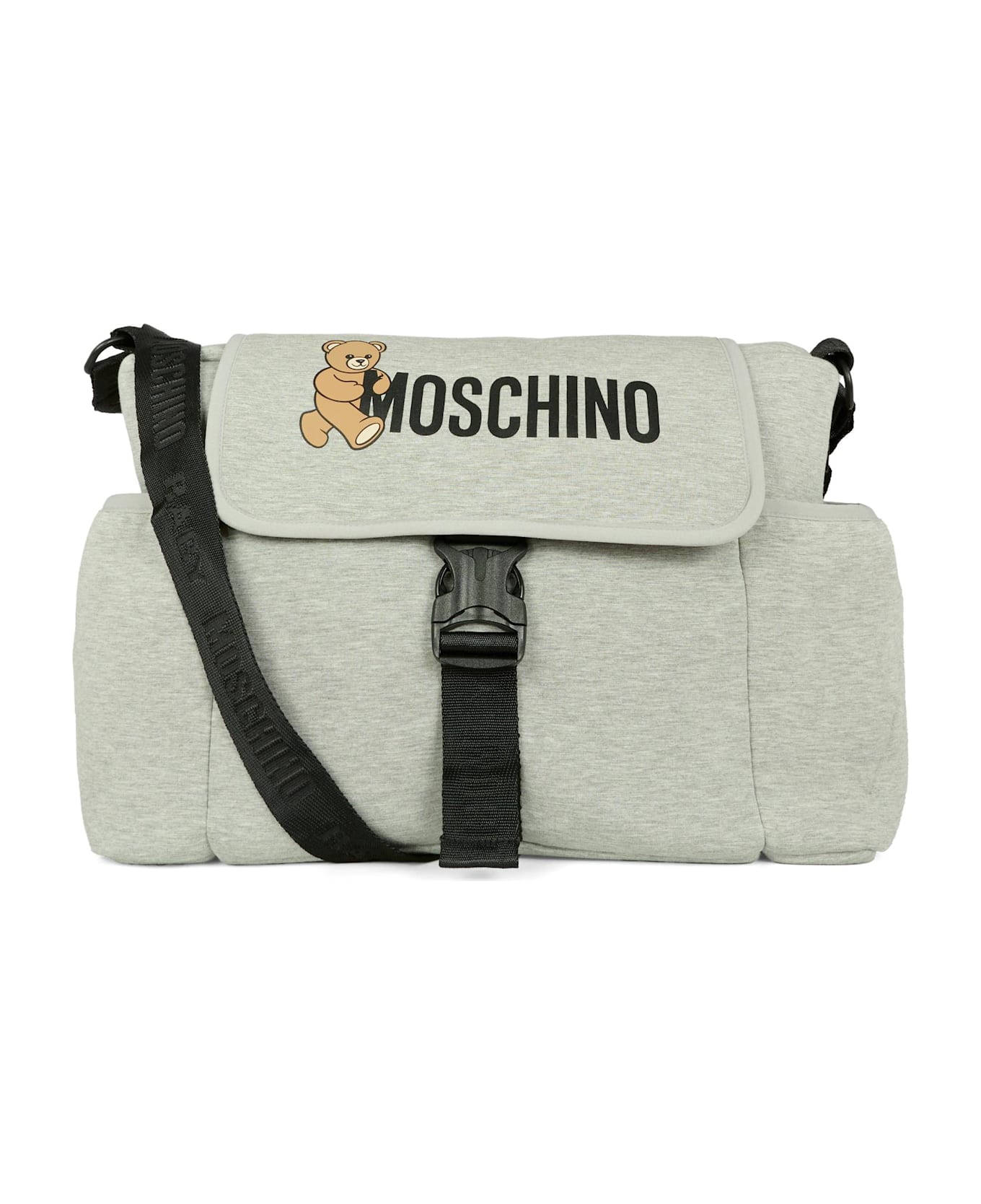 Grey changing bag from Moschino Kids, with an adjustable shoulder strap, top zip closure, front flap with snap buckle, front pocket, side pockets, and an internal changing mat. It is embellished with a Teddy Bear print and logo on the front.