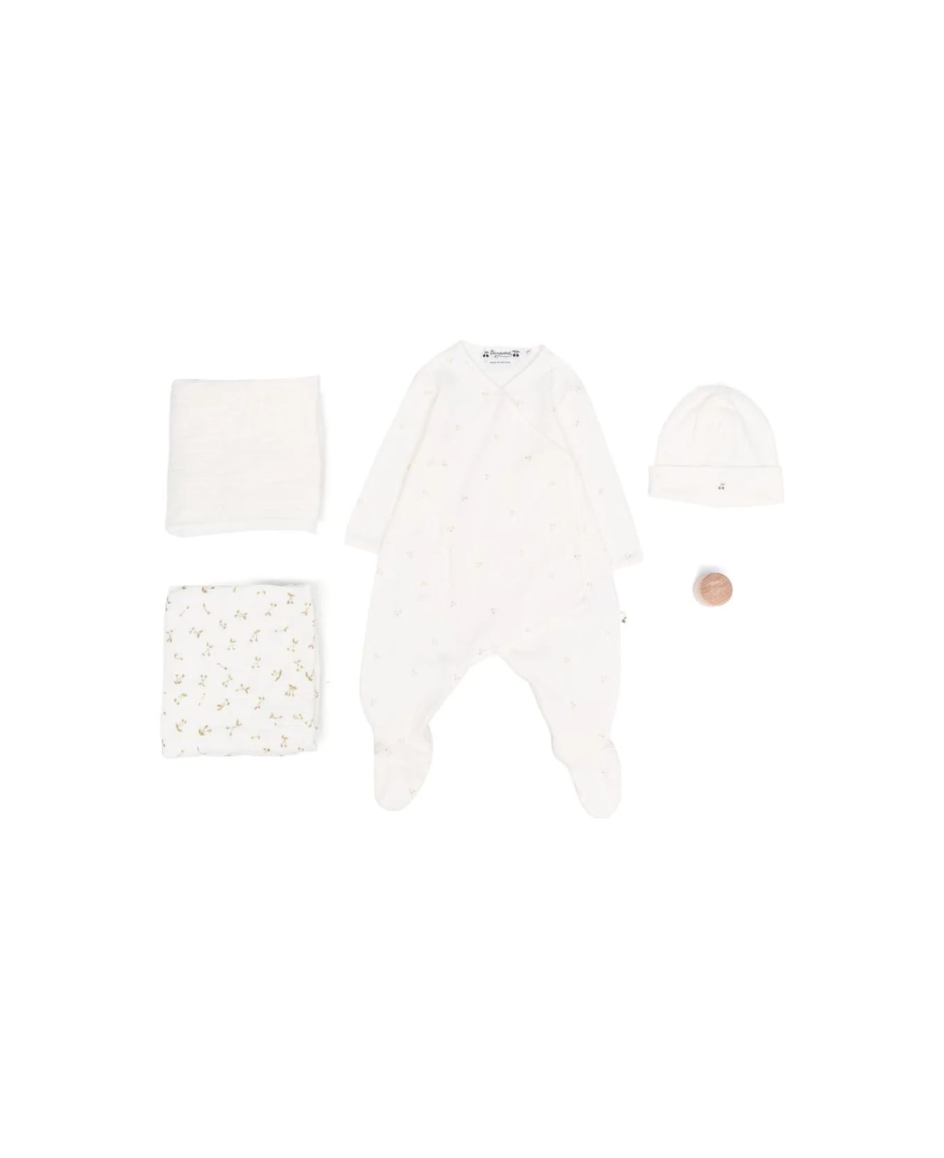 Bonpoint gift box containing a key ring ideal for baby's first few nights, a wrap-around cotton pajama set printed with the emblematic golden cherries in size 3 months, a set of two matching double cotton headbands and a delicate cotton cap with comfortable lapel decorated with a discreet cherry. The Maison's signature engraved tooth box is offered.