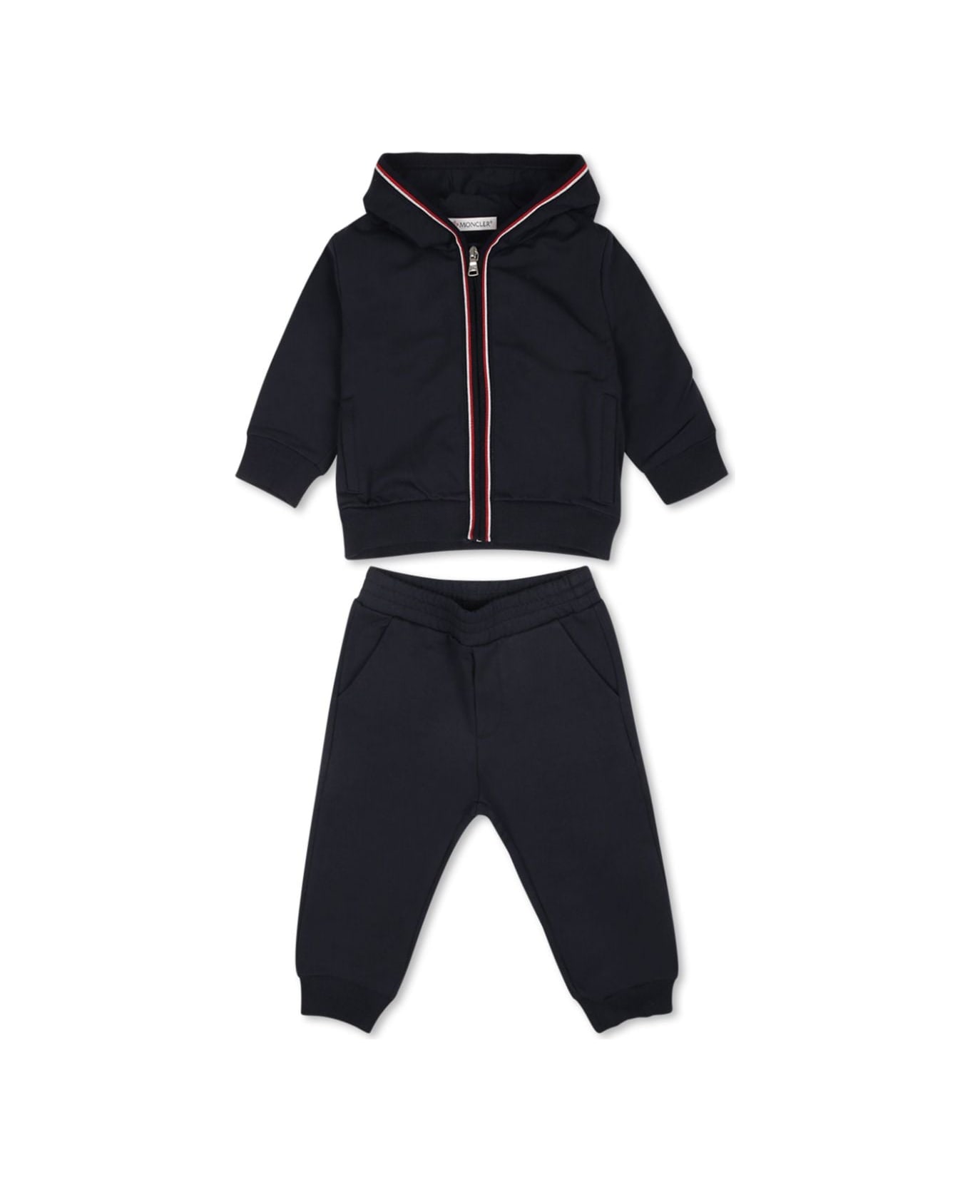 Moncler kids unisex baby blue tracksuit. Hoodie, logo patch on the sleeve,front zip closure, long sleeves, ribbed hem and cuffs, straight hem. Sports trousers, elasticated waist, straight cut, shaped back pocket, back logo patch and ribbed hems. cotton 94%, elastane 6%