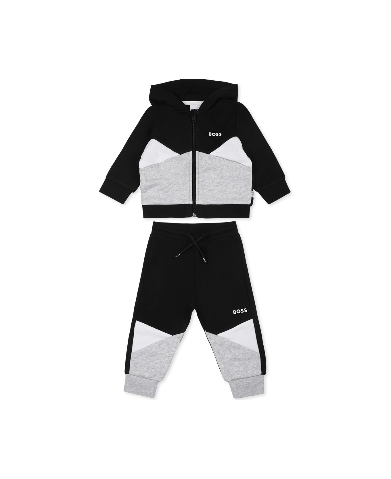 Black cotton blend sweatshirt and trousers set, with colour block design. Long sleeved sweatshirt with hood, front zip fastening, ribbed cuffs and hem. It is embellished with logo on the chest. Trousers with elasticated waist, drawstring and ribbed ankles. They are embellished with a logo on the front.