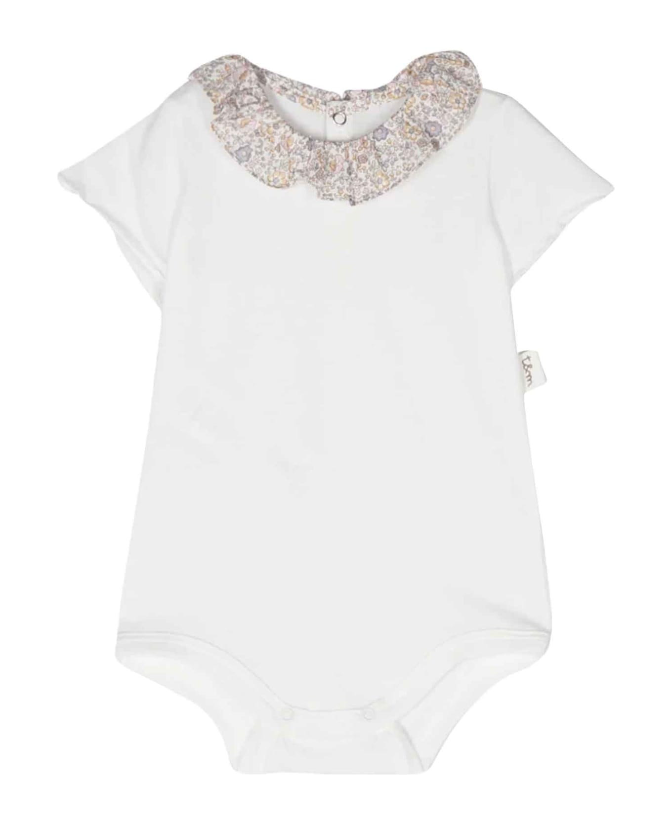 white body baby girl TEDDY & MINOU. Floral print, contrast collar, ruffle collar, short sleeves, back snap button closure and concealed snap button closure. 100% Cotton