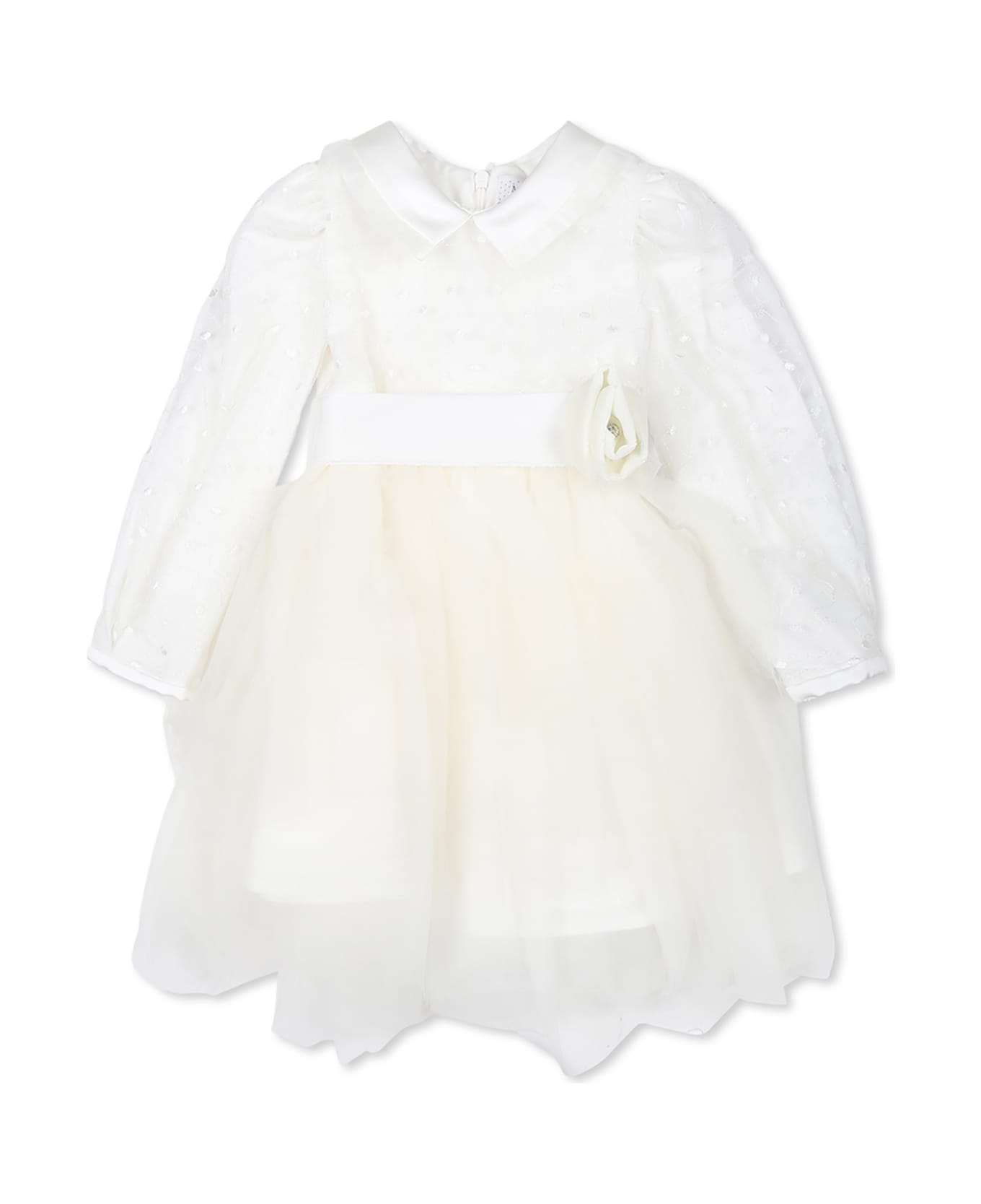 White tulle dress, long sleeves, with pointed collar with ruffles, embroidered bodice, zip closure on the back, belt at the waist and flounced skirt. It is embellished with velvet rose and rhinestones on the front