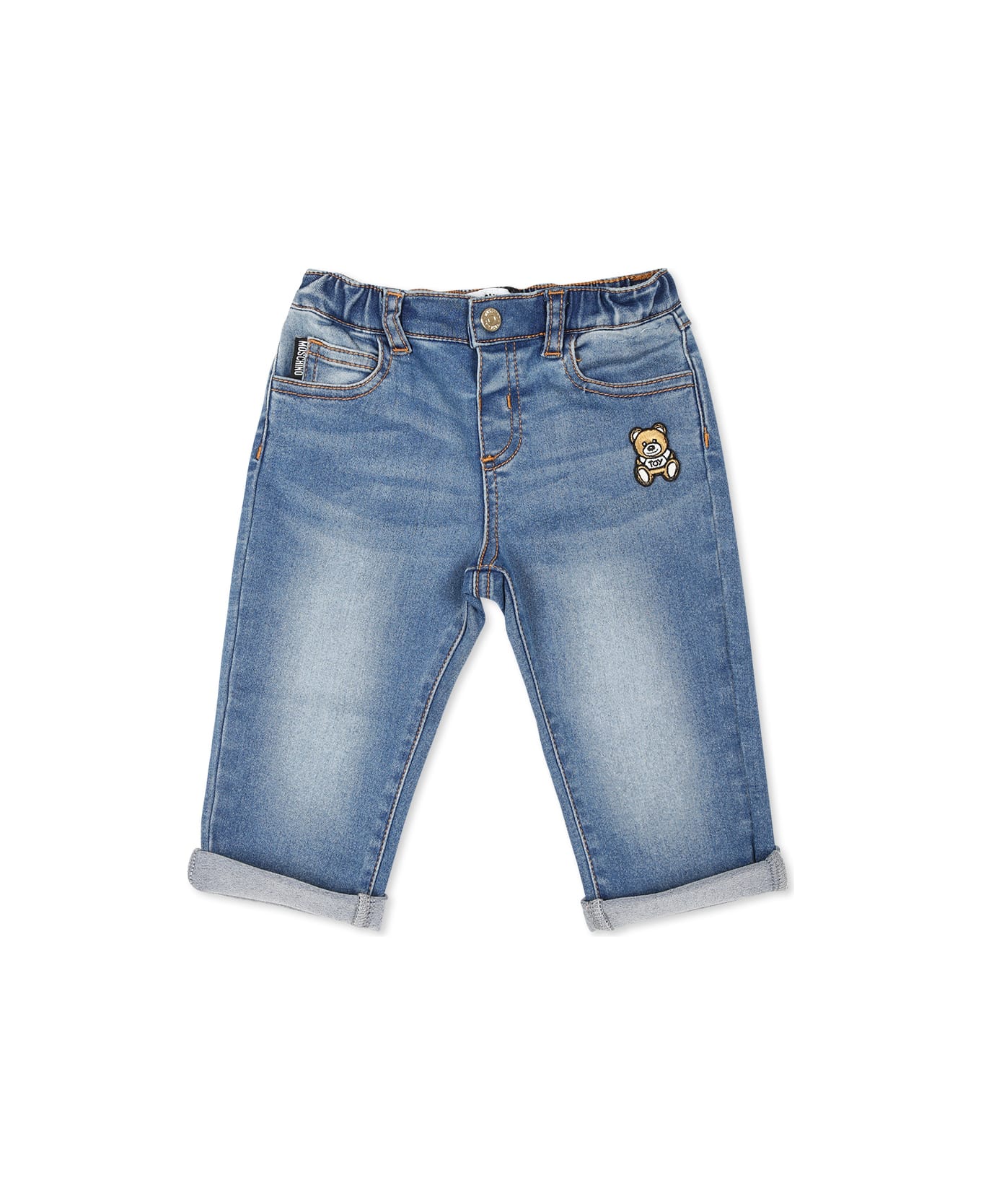 Blue denim jeans from the Moschino Kids brand, five pockets, with front button closure, elasticated waist and turn-ups at the bottom. They are embellished with Teddy Bear-shaped patches on the front.
