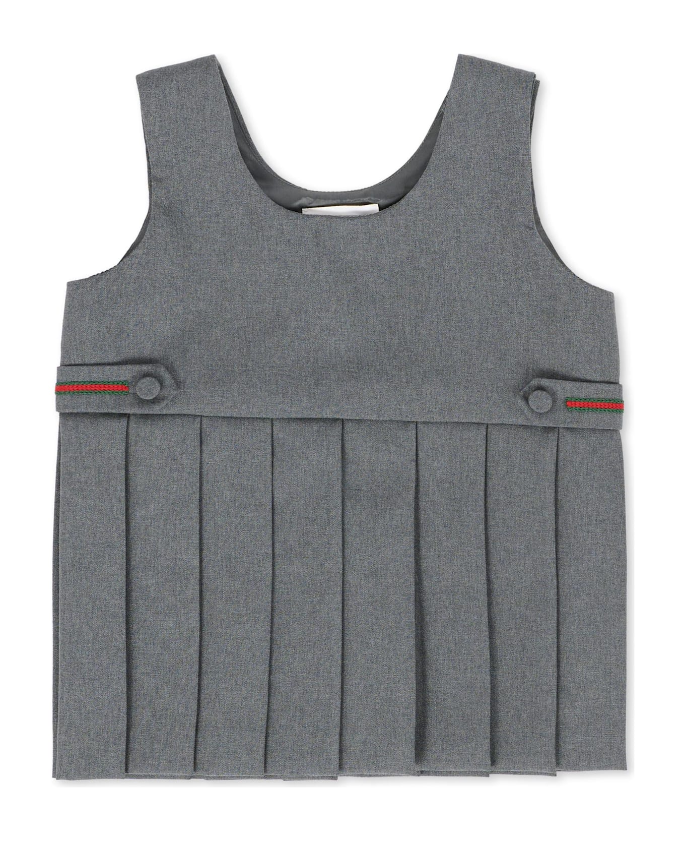 Grey sleeveless wool dress from luxury brand Gucci Kids features a round neckline, one-shoulder button, and a pleated skirt. It is embellished with red and green Web detail on the sides, for a sporty, retro-inspired touch.