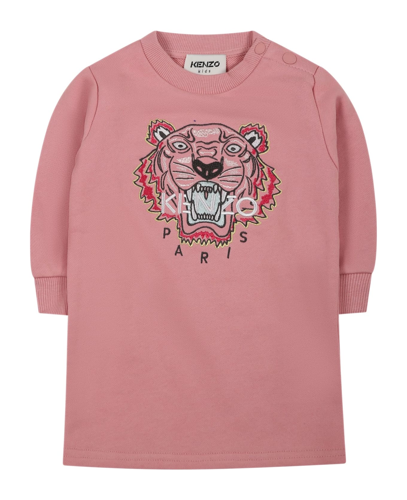 Pink dress, in brushed cotton, with long sleeves, ribbed crew-neck and cuffs, closure with automatic buttons on the shoulder. It is embellished with Kotora and logo embroided on the front.