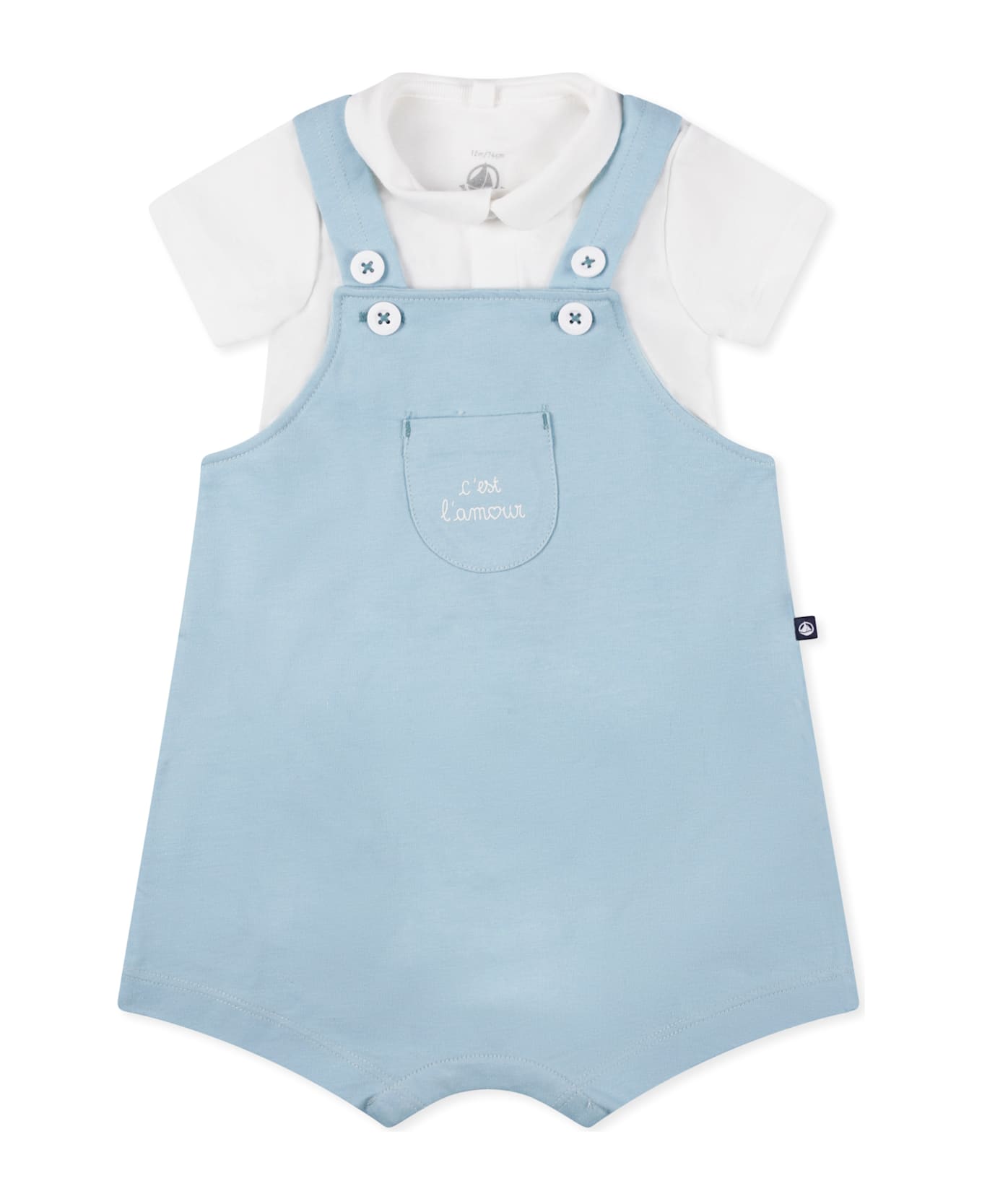 Light blue organic cotton dungarees, composed of dungares and bodysuit. Dungarees with shoulder pads, buttons on the front, automatic buttons between the legs and front pocket; it is embellished with writing on the front. White short-sleeved bodysuit, with peter pan collar, automatic button closure on the front and between the legs; it is embellished with on the front.