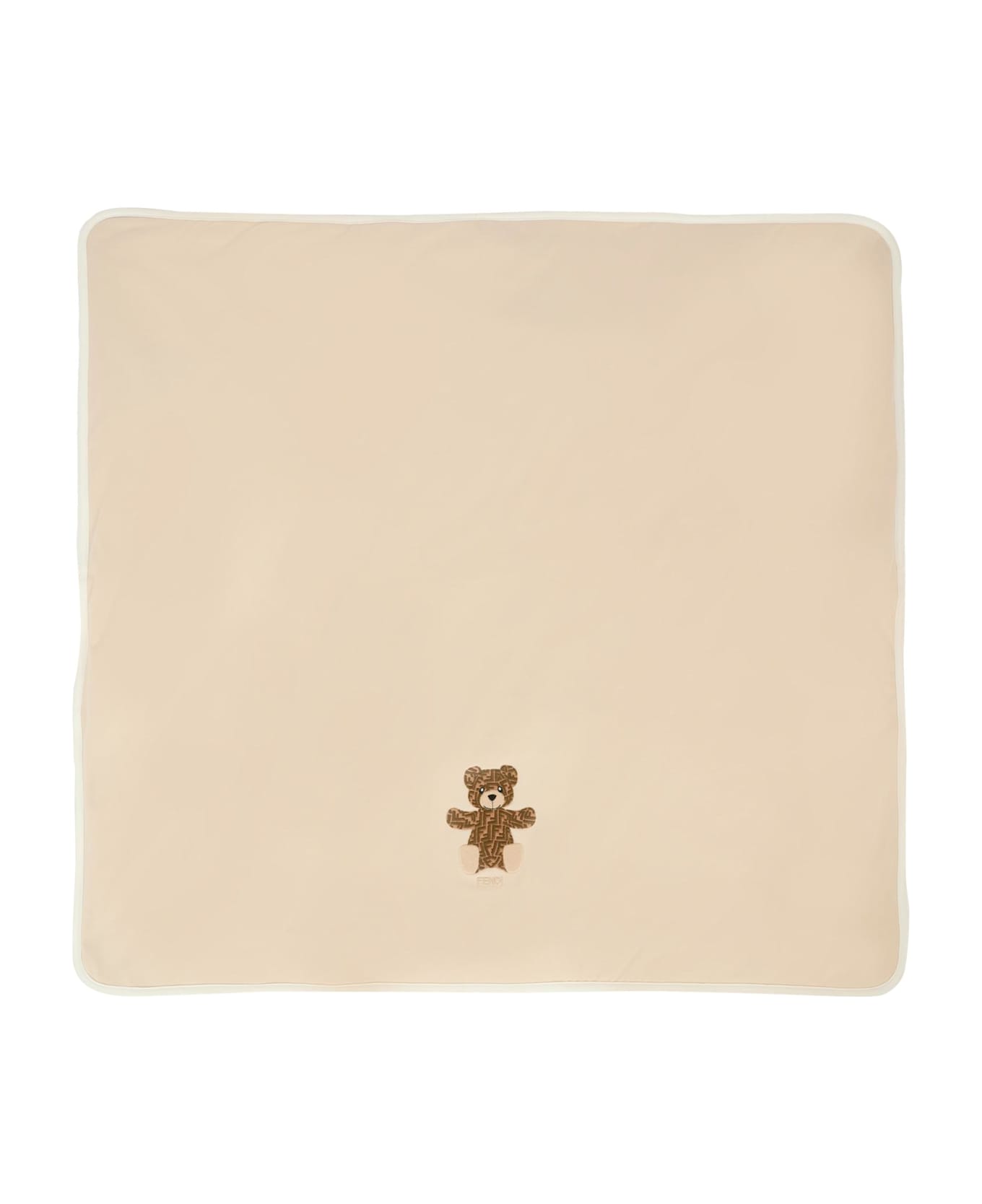 Padded ivory blanket, with white profiles. It is embellished with embroidered Fendi teddy bear on the front. 80 x 78cm.