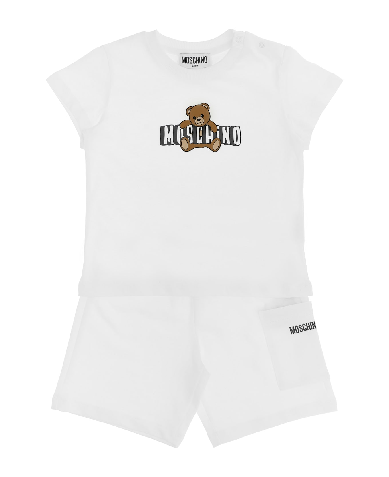 Cotton jersey suit consisting of crewneck t-shirt, front 'Moschino Teddy Bear' print, snap buttons on the left shoulder, short sleeves, Bermuda shorts with elastic waistband and cargo pocket with lettering logo print. Composition: 100% cotton