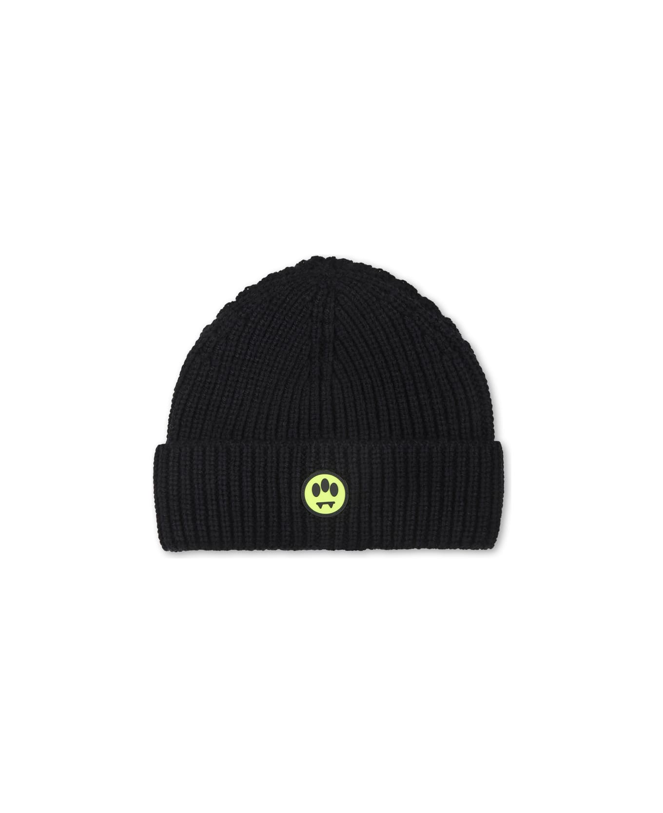 Black ribbed hat in wool blend, with turn-up. It is embellished with iconic yellow smiley applied on the front. It comes with a yellow logo key ring.