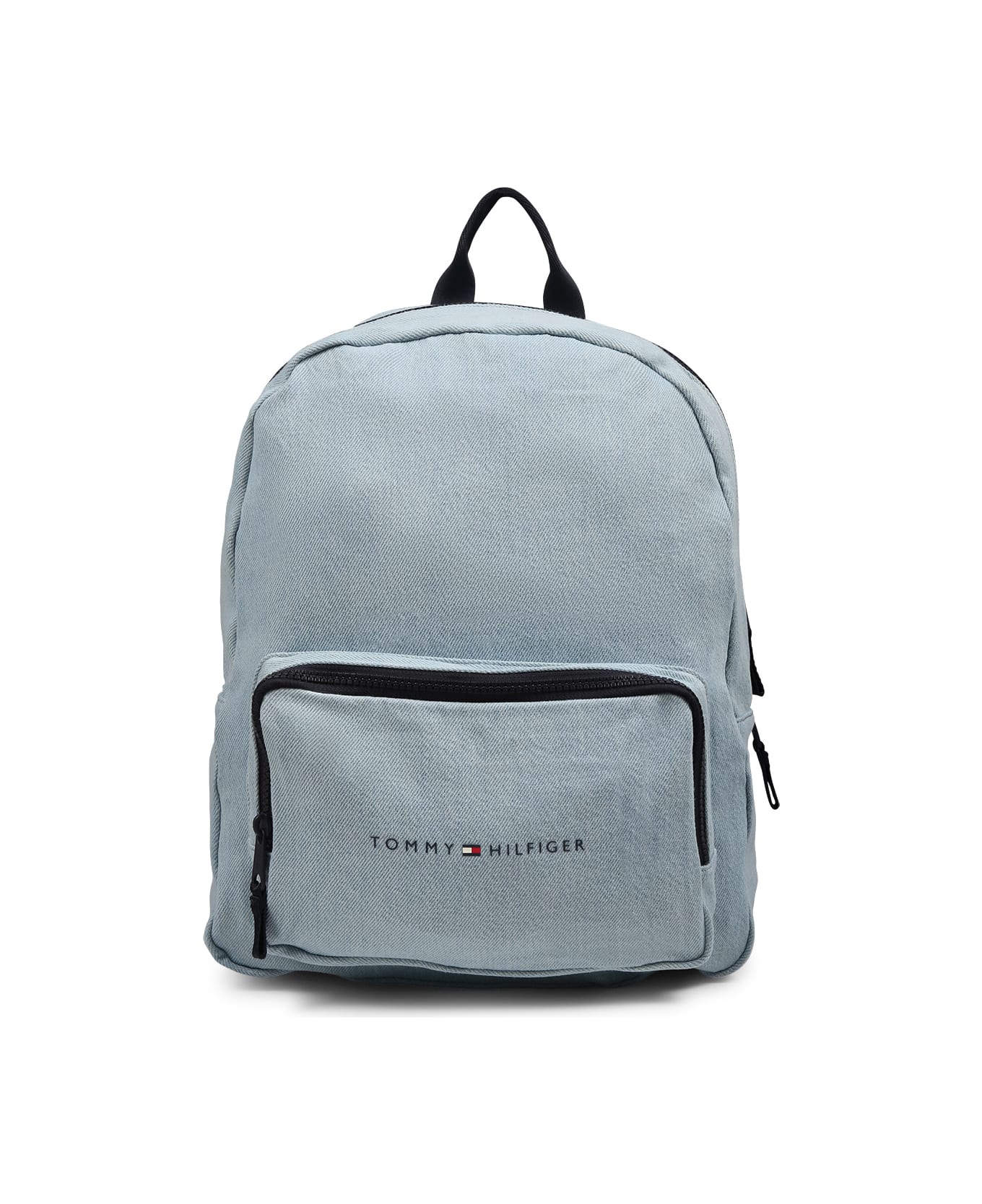 Cotton denim backpack, with handle, top zip closure, front zip pocket and adjustable shoulder straps. It is embellished with logo and iconic flag embroidered on the front.