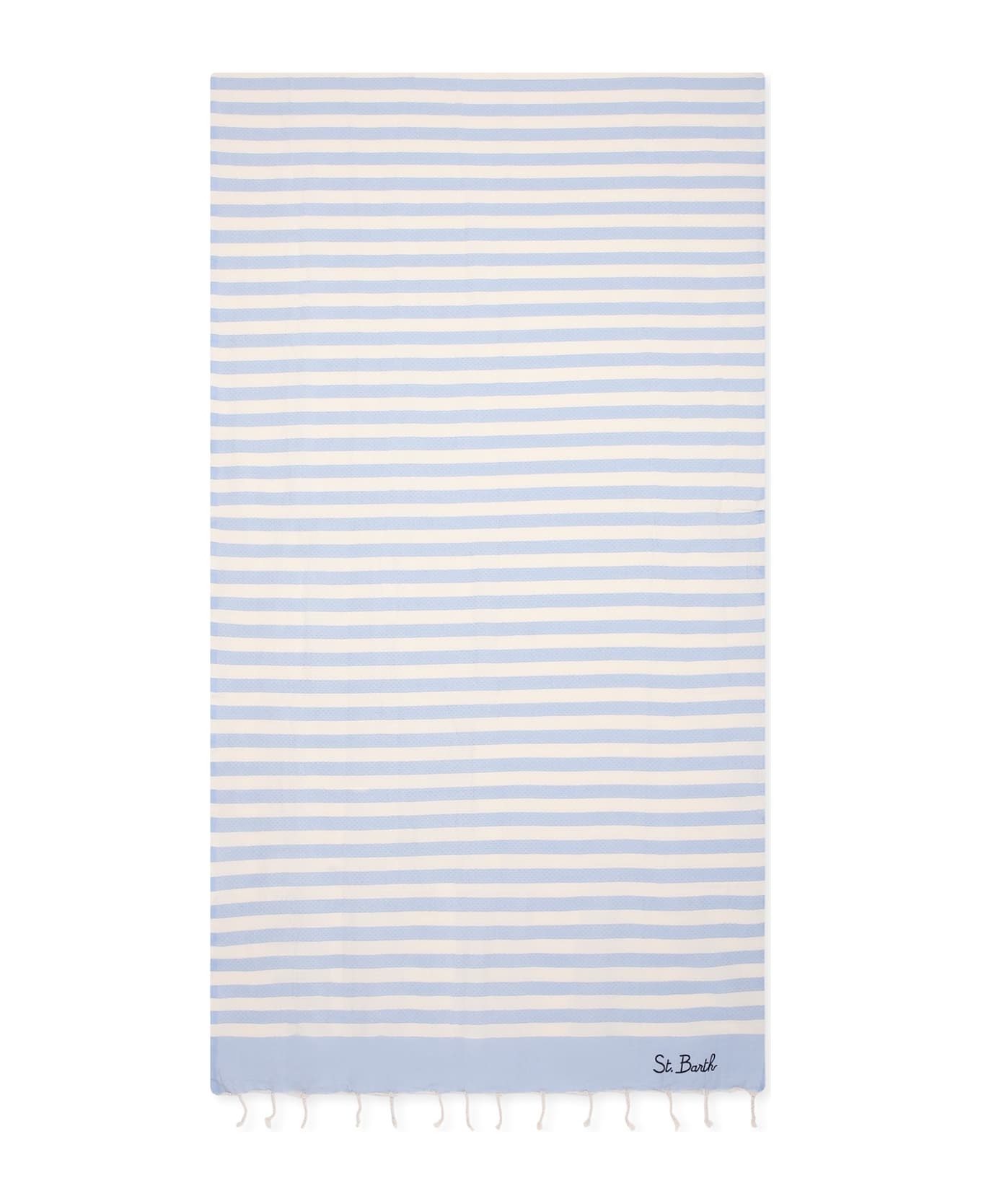Light blue and ivory beach towel, in striped cotton. It is embellished with blue logo embroidered on the front.