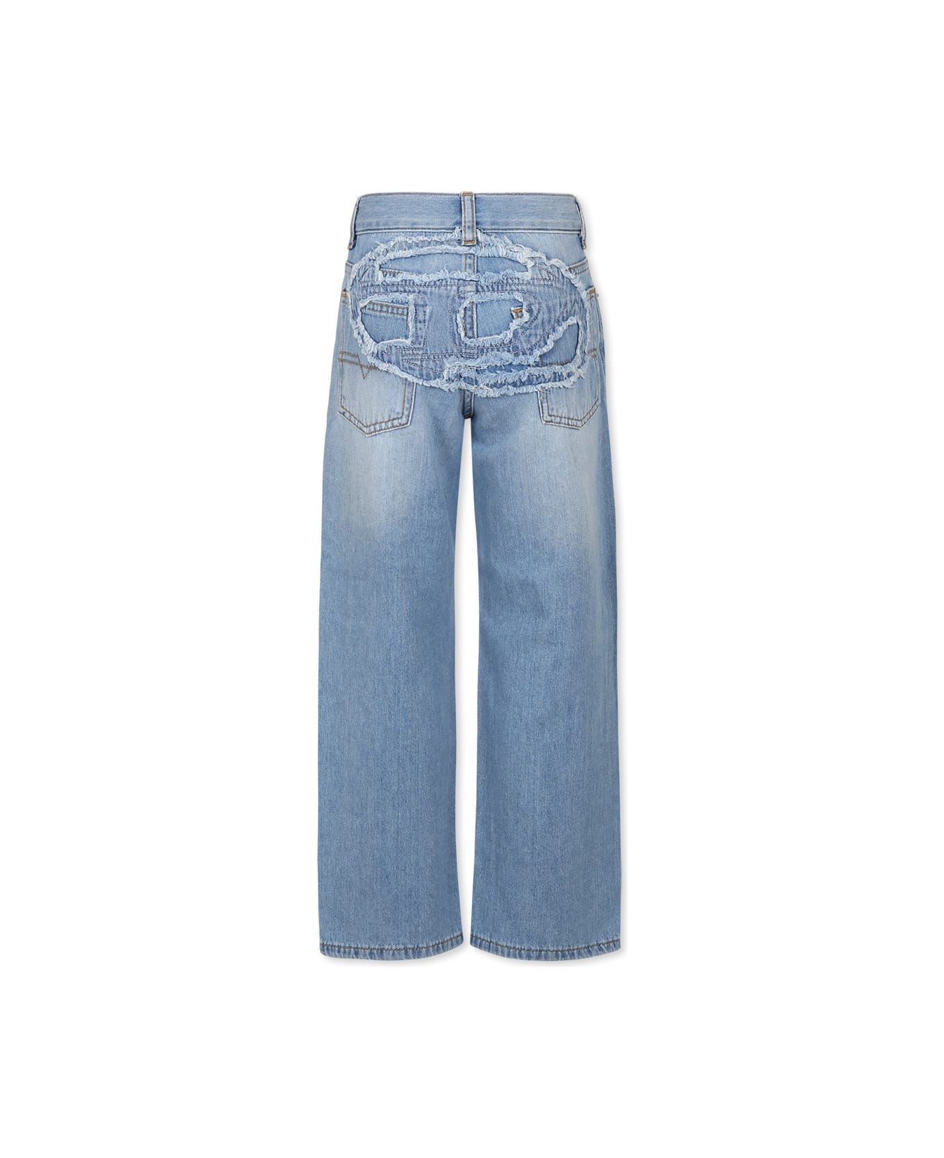 Blue denim jeans with five pockets, belt loops, front zip and button fastening, adjustable waist thanks to internal elastic with buttons. They are embellished with a logo patch on the front and a fringed logo on the back.