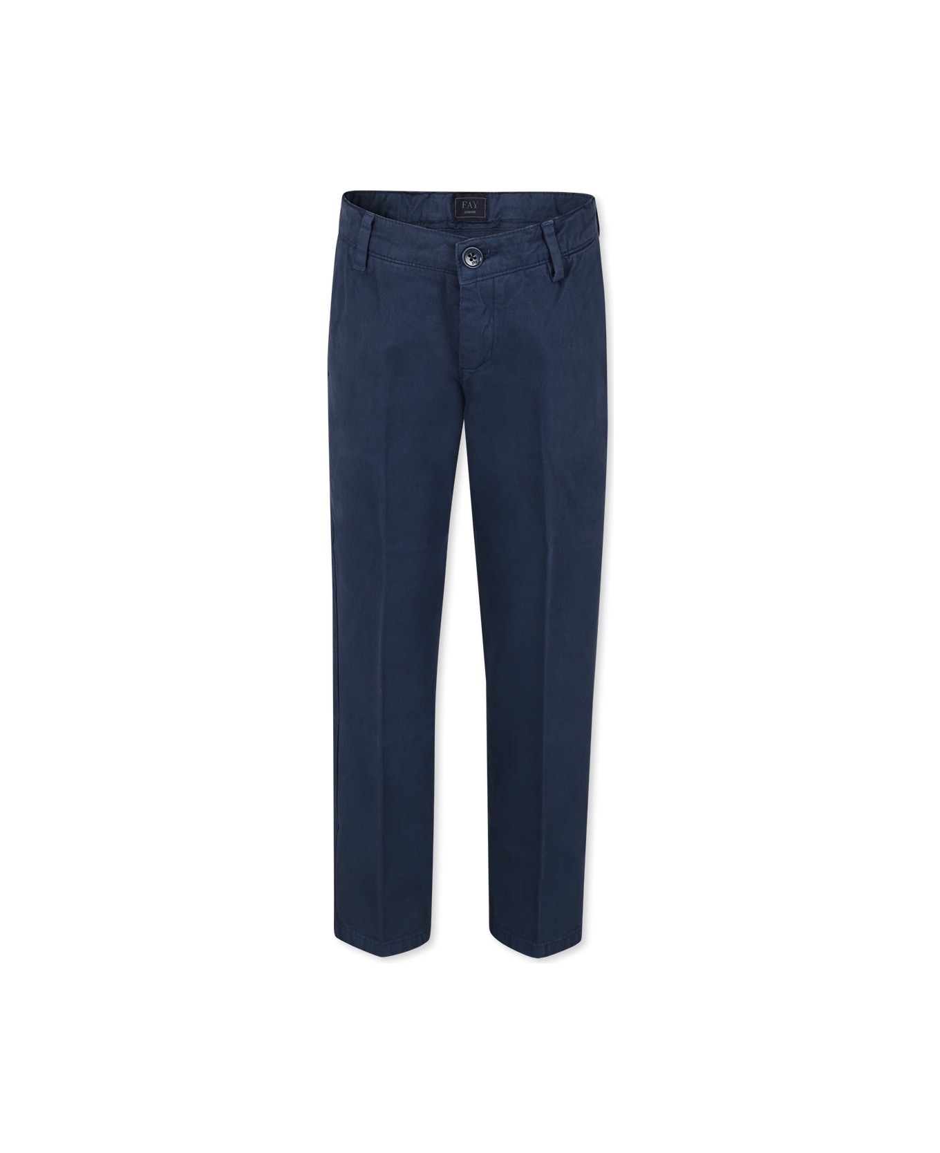 Blue cotton trousers, with belt loops, front zip and button fastening, adjustable waist thanks to internal elastic with buttons, side pockets and back pockets. They are embellished with an embroidered logo on the back.