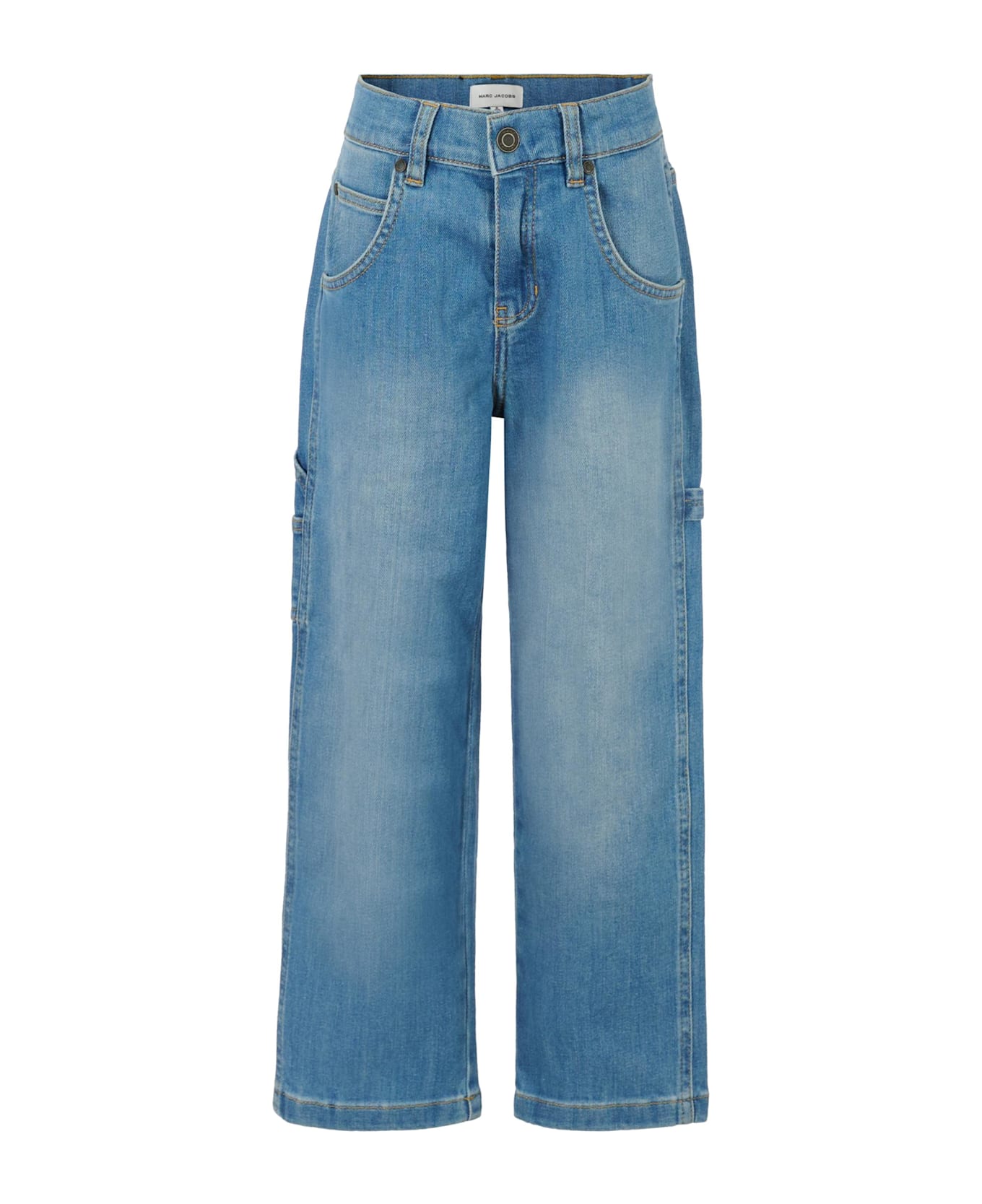 Five-pocket denim jeans with belt loops, a front zip and snap closure, and a patch pocket on the back. Adjustable waistband with an internal elastic band and buttons. It is embellished with an embroidered logo and a black logo patch on the back.