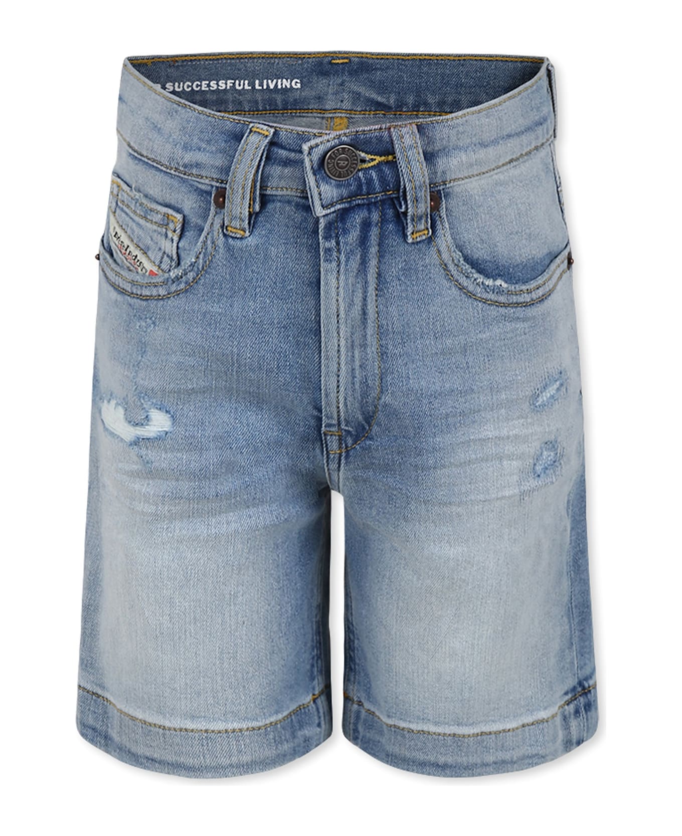 Five-pocket denim shorts with belt loops, front zip and button fastening, adjustable waist thanks to internal elastic with buttons and fake worn-effect rips. They are embellished with a logo patch on the front and back.