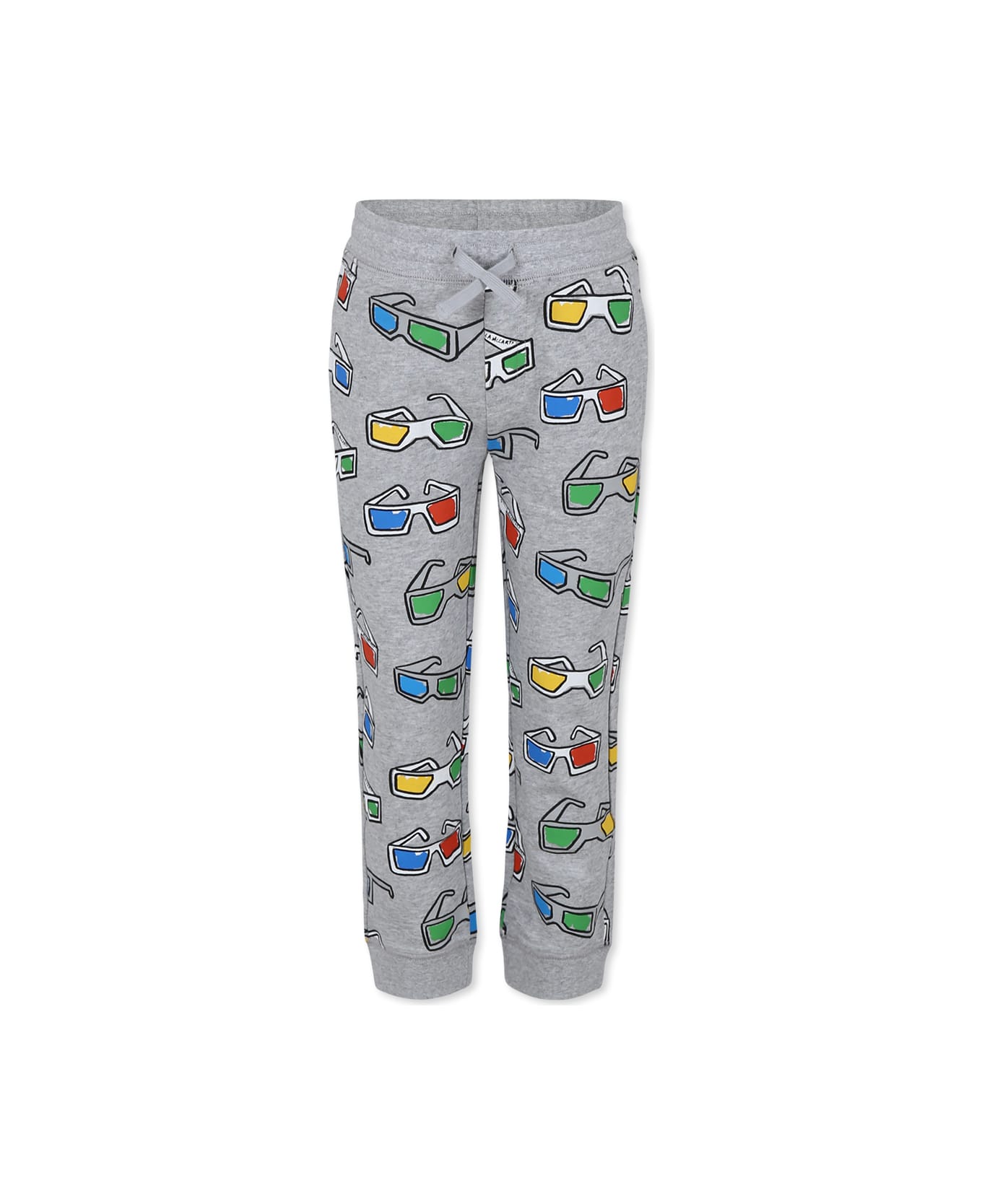 Grey organic cotton brushed trousers with elasticated waist, drawstring, side pockets, patch pocket on the back and ribbed ankles. They are embellished with all-over printed sunglasses.