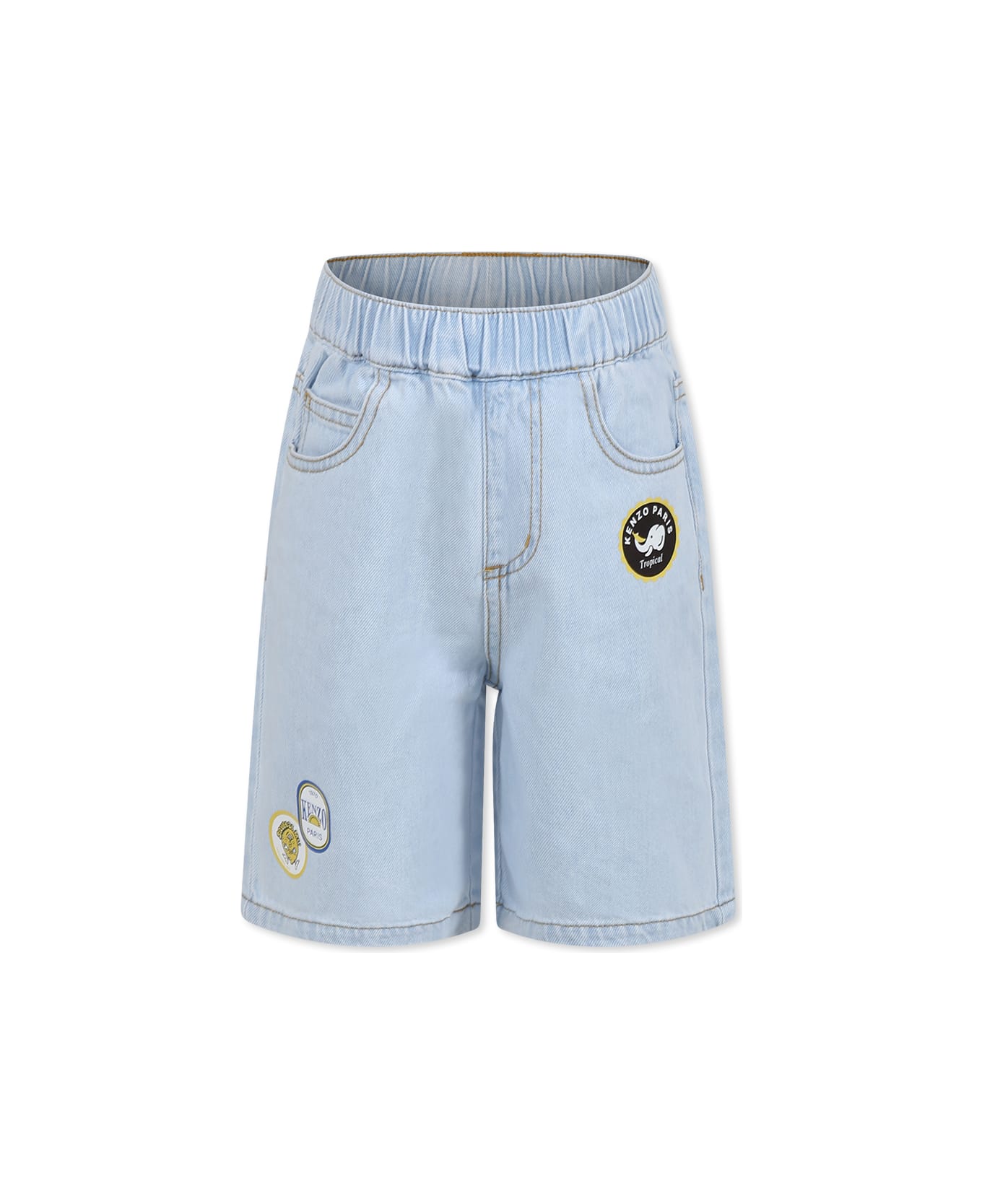 Light blue denim shorts with elasticated waistband, pockets on the front and back. They are embellished with Fruits Stickers patches, inspired by vintage fruit stickers, on the front.