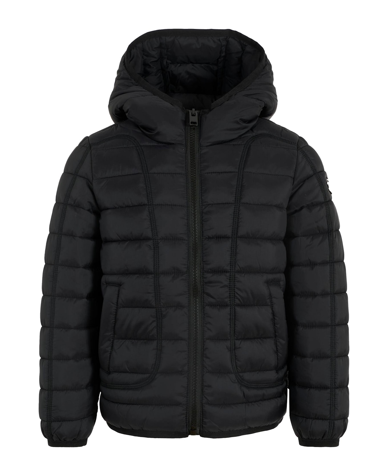 Lightly padded and quilted black down jacket with hood, front zip fastening, side pockets, elasticated cuffs and hem. It is embellished with an embroidered logo on the sleeve.