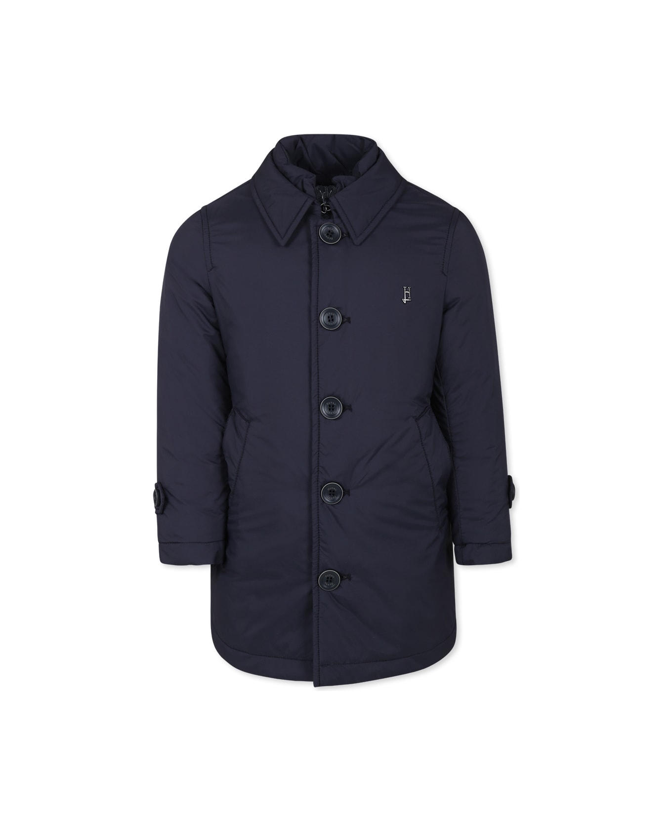 Blue padded coat made from nylon, with double fastening with buttons and zip, drooling with hook, side pockets and rip on the back; it is embellished with mettalic logo appliqued on the breast and on the back.