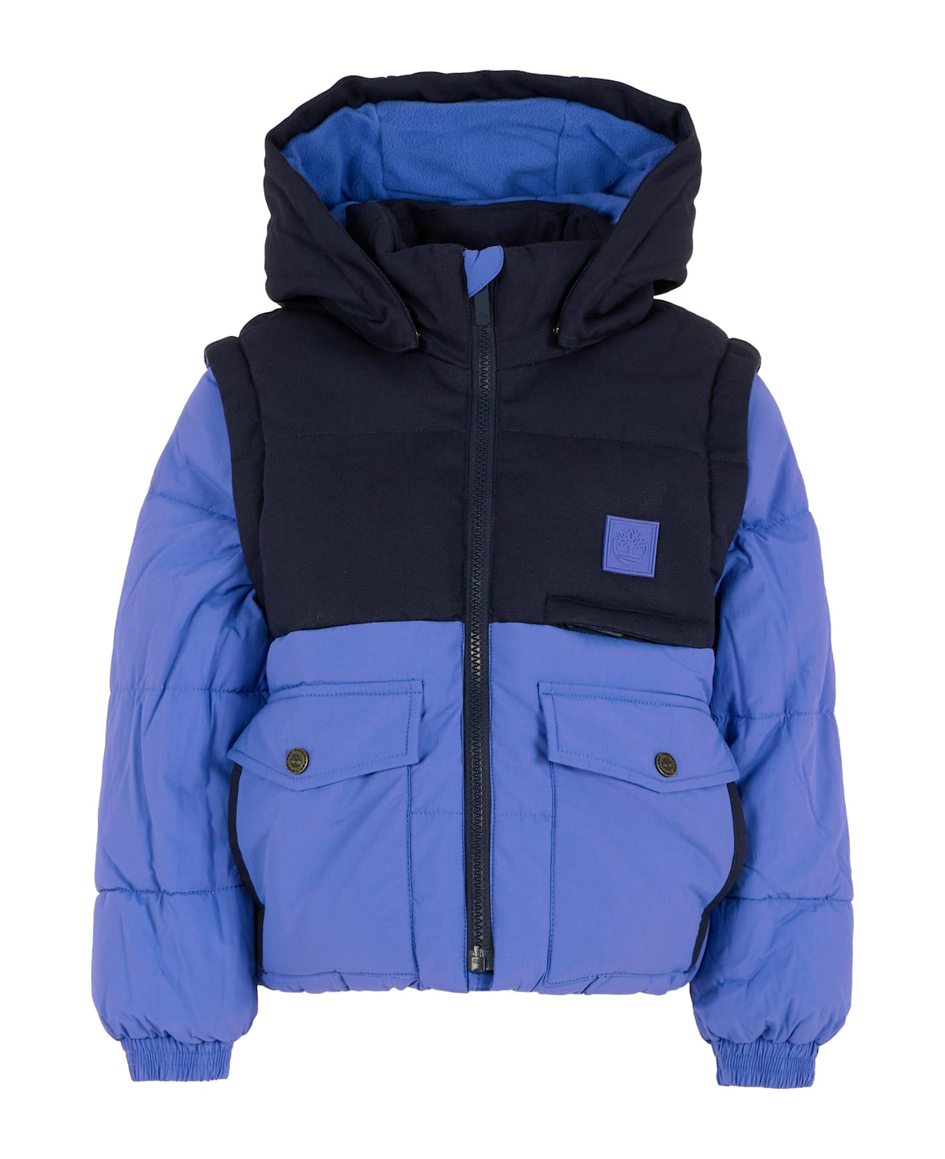 Heavyweight, waterproof, padded and quilted blue down jacket with a fleece lining, removable long sleeves, a detachable hood, a front zip fastening, front flap and button pockets, a zipped chest pocket, and elasticated cuffs. It is embellished with a rubberized logo patch on the chest.