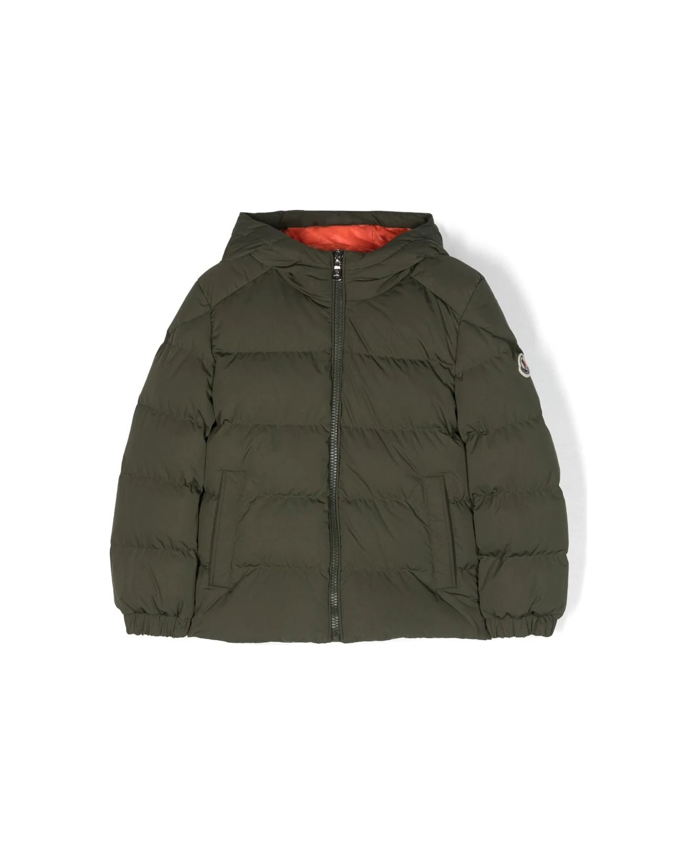 Eric down jacket for boys signed Moncler Enfant made of micro soft in military green: an ultra light nylon fabric that stands out for its excellent water-repellent properties. This model features a jersey lining, down padding, a fixed hood, an embroidered logo on the back, elasticated cuffs and hem, a logo patch on the sleeve, a front zip fastening and welt pockets with snap fastening.