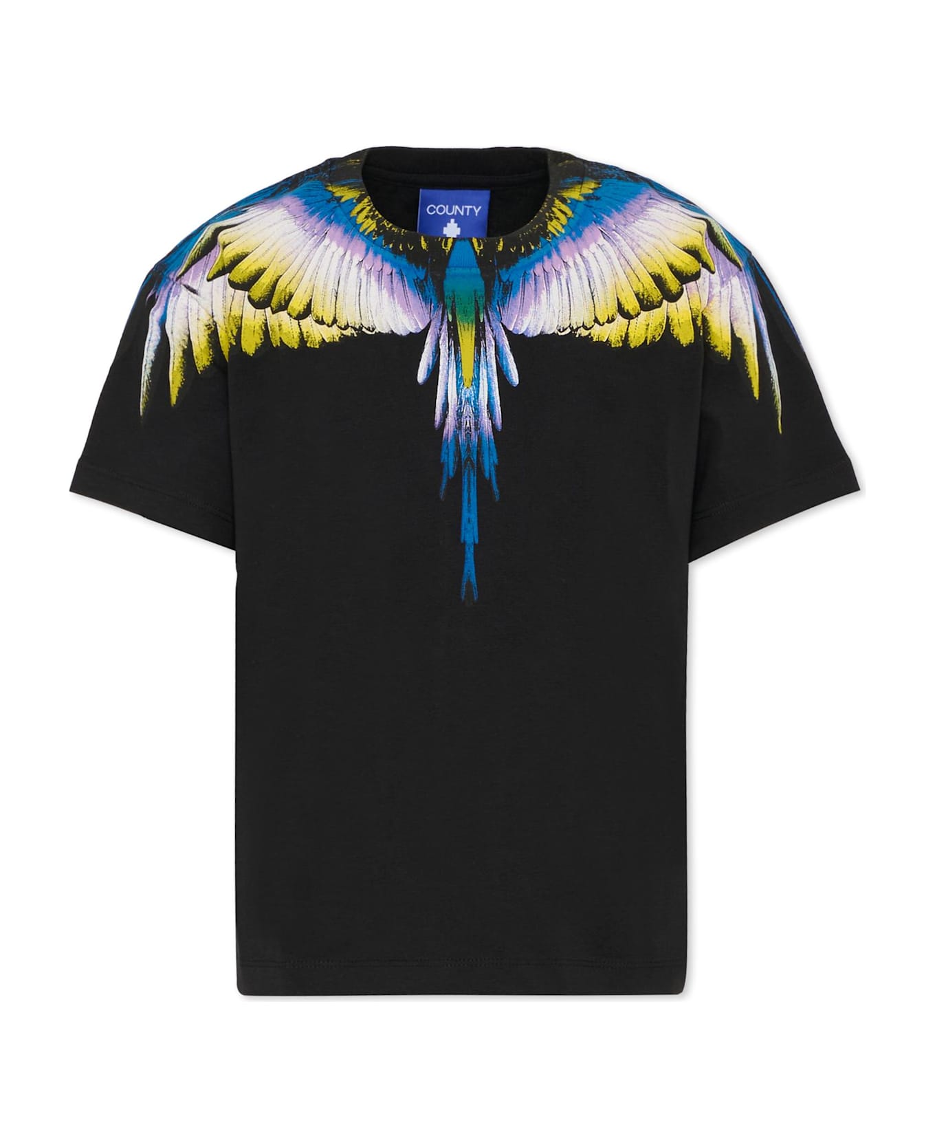 Black cotton T-shirt with short sleeves and a ribbed crew neck. It is embellished with iconic wings on the shoulders