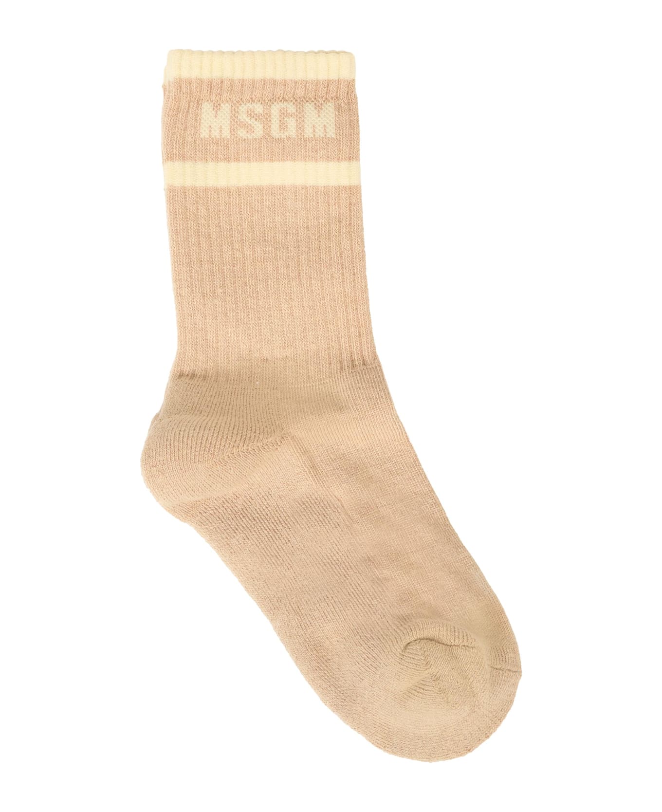 Beige socks made of cotton, with a ribbed hem. They are embellished with logo and ivory bands on the upper.