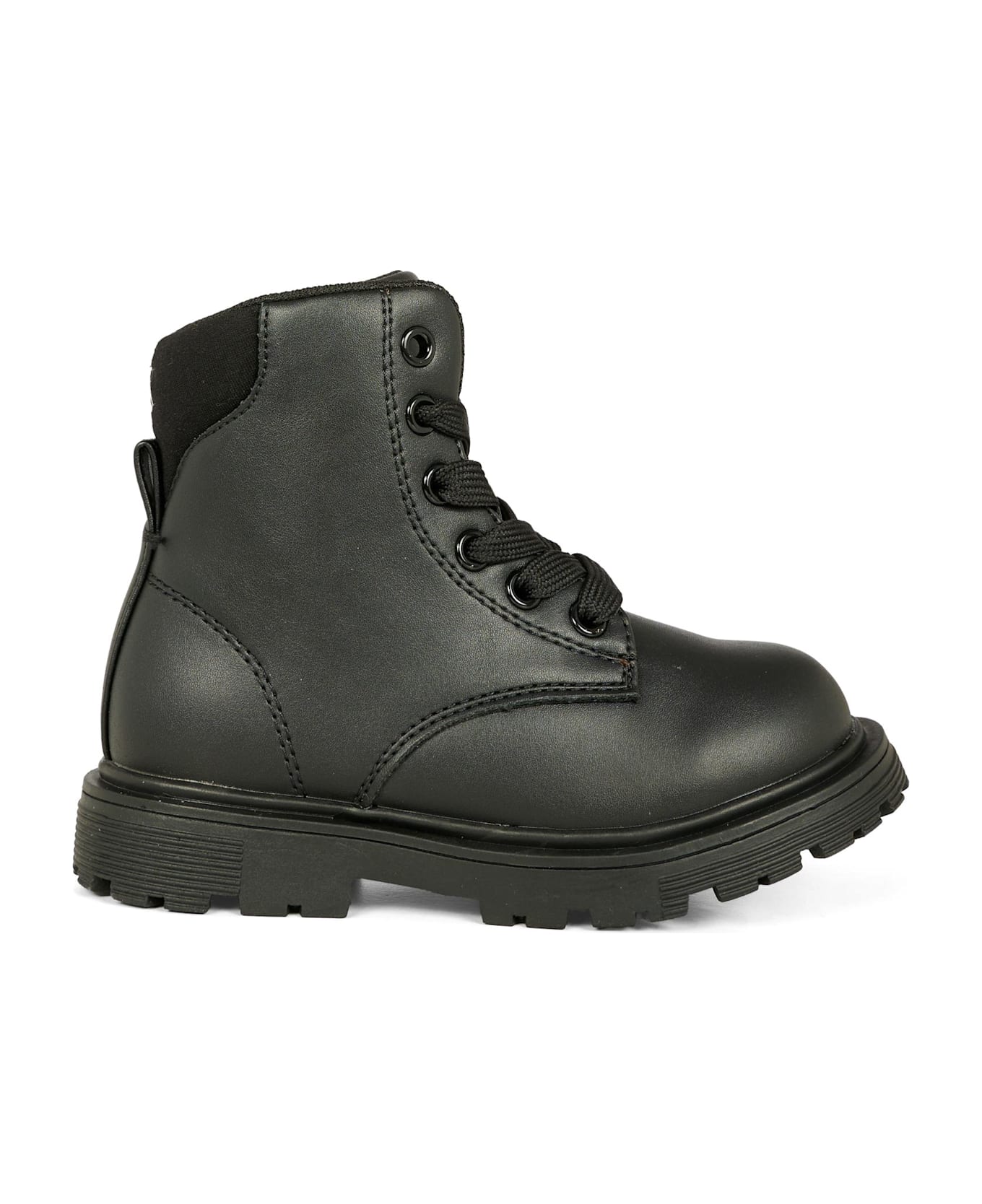 Black faux leather combat boots with rubber soles, side zip fastening, laces, and a round toe. They are embellished with logo on the back.