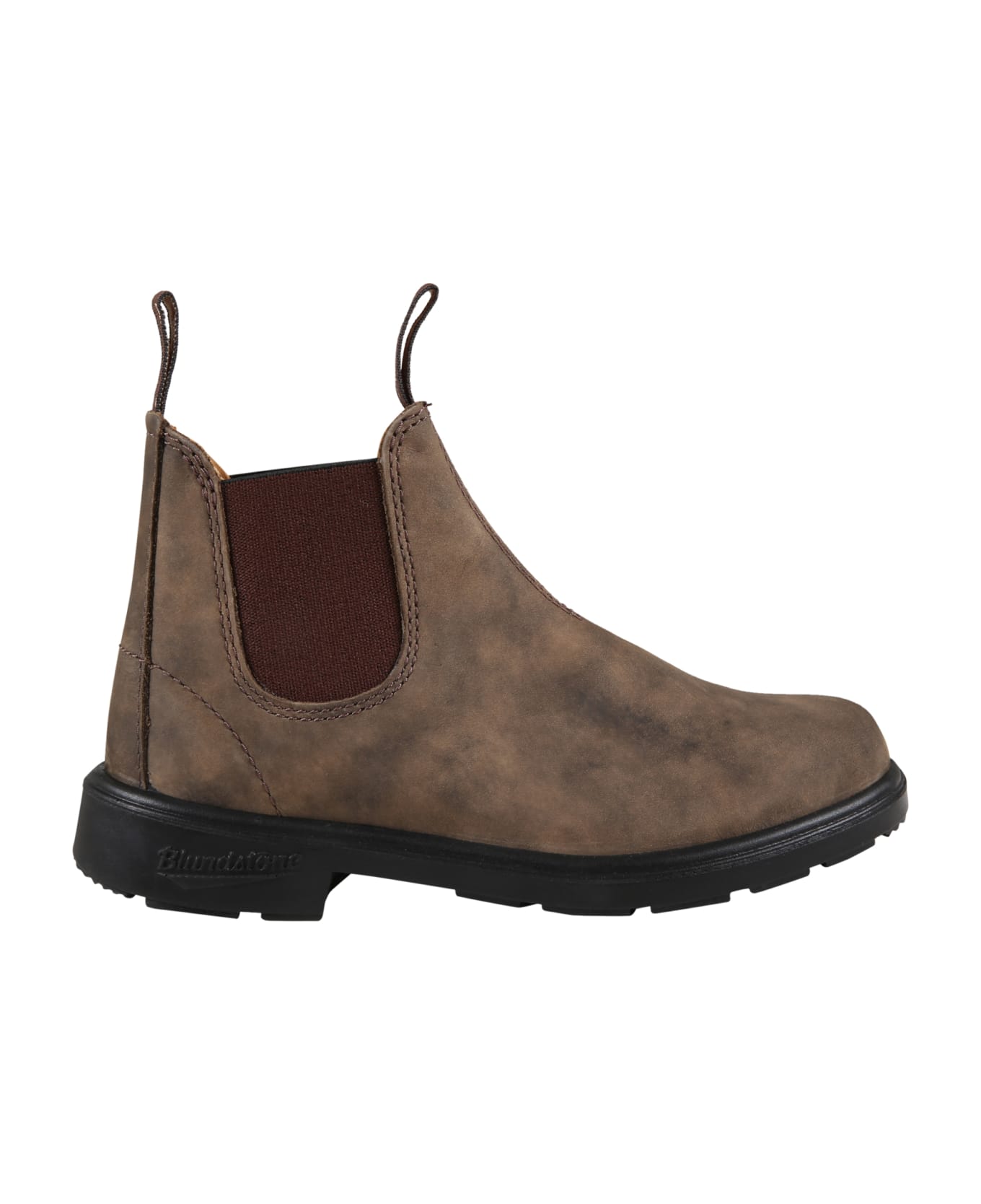 Brown boots, made from leather, with rubber sole and side elasticized rips. They are embellished with logo tongues, on the front and back