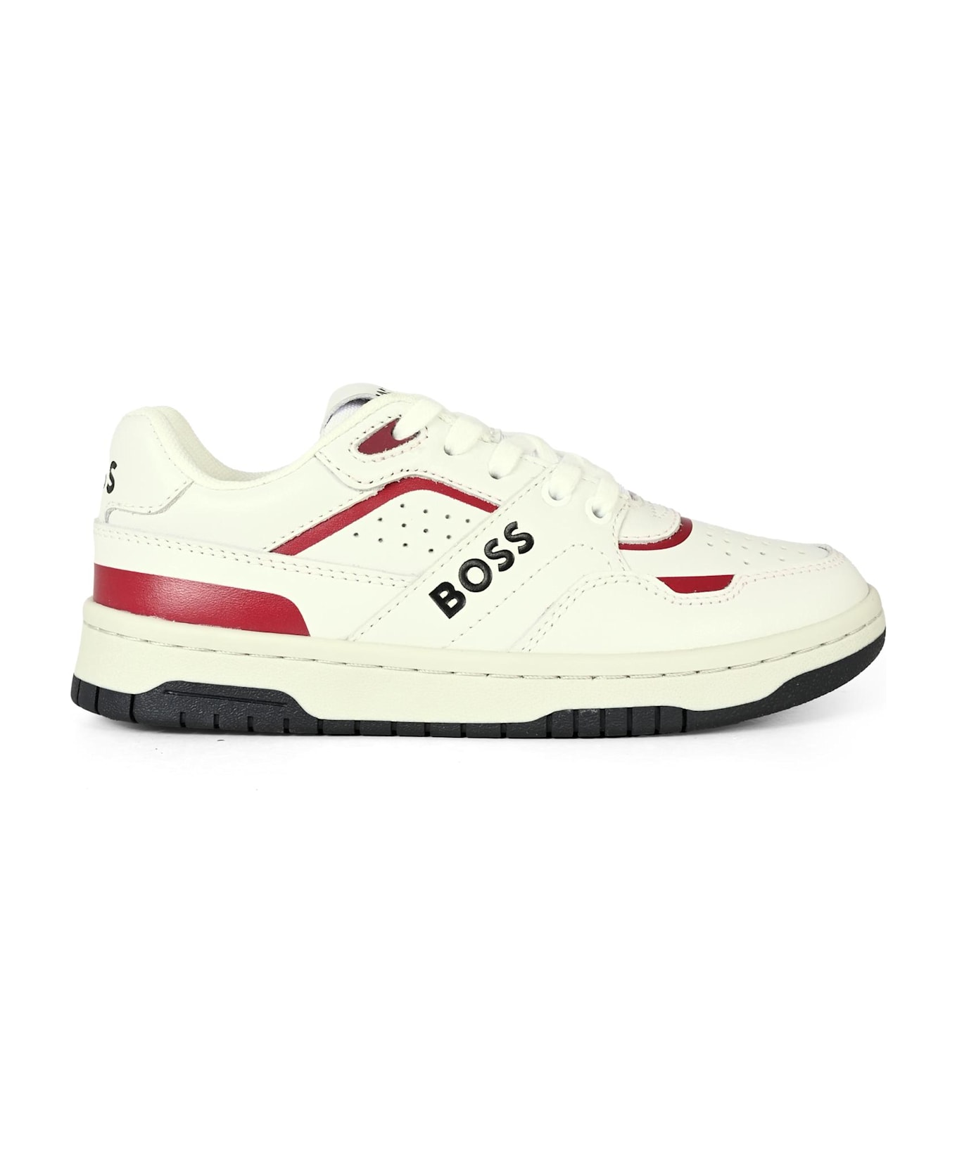 Ivory leather sneakers, with rubber sole, laces, burgundy inserts, perforated details on the upper and round toe. They are embellished with logo on one side and on the back.