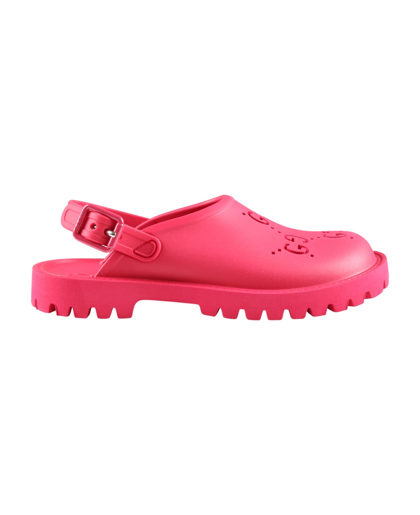 Red sandals with rubber sole and adjustable buckle closure on the side. They are embellished with an all-over GG motif.