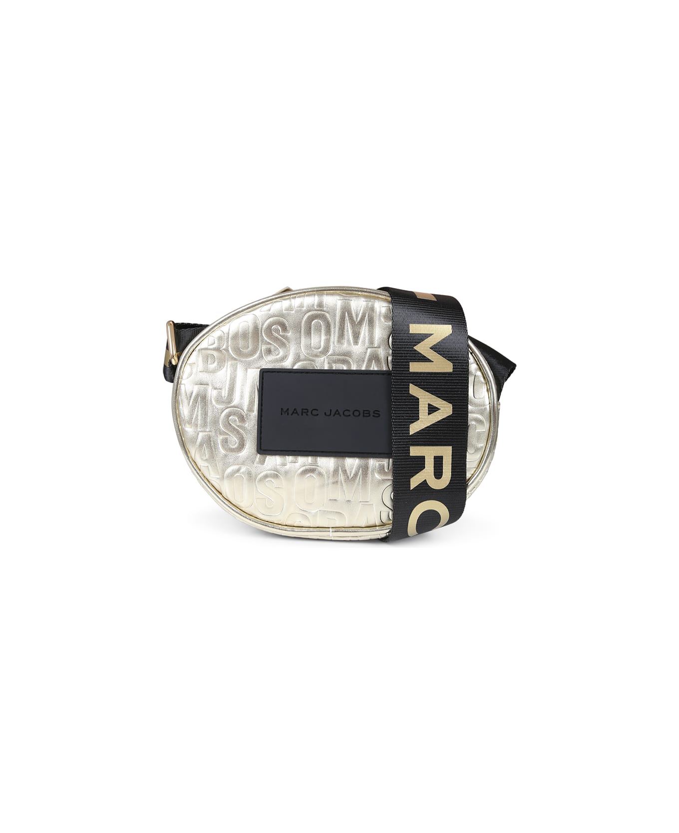 Metallic gold bag from the Marc Jacobs brand, with top zip closure and adjustable shoulder strap. It is embellished with all-over logo monogram and rubberized logo patch on the front.