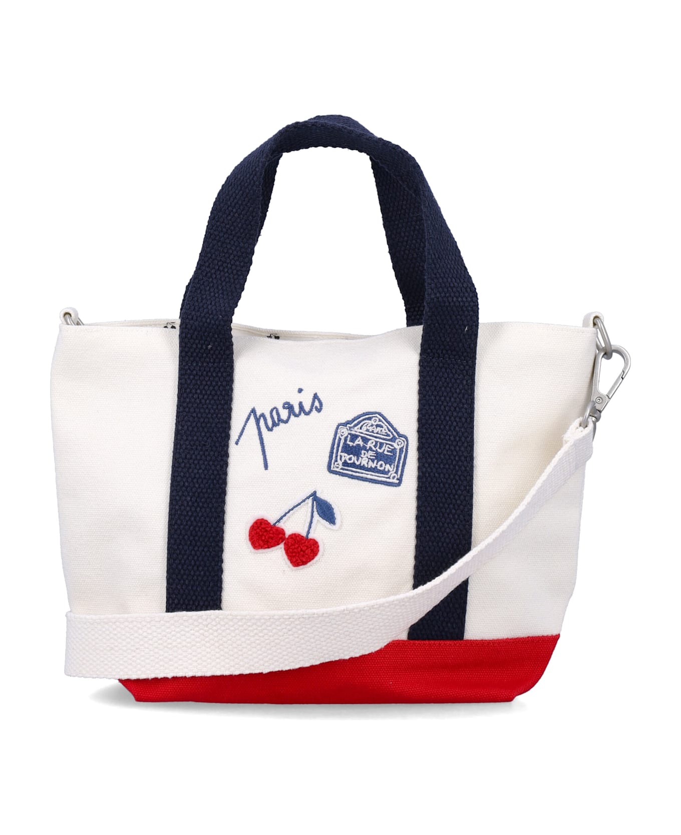Cotton Canvas Cabas Shoulder Bag By Bonpoint. Featuring: Contrast Top Handles Magnetic Closure Adjustable And Removable Shoulder Strap Embroidery Details At Front Contrast Bottom Main Compartment Signature Cherry Print Lining Height: 17 Cm Width: 26 Cm Depth: 8,5 Cm