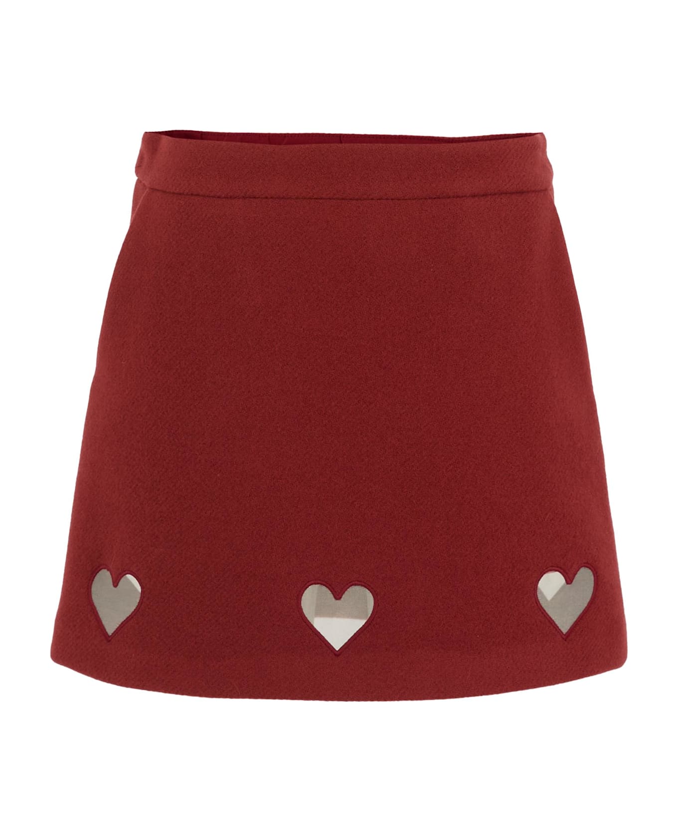 Burgundy wool blend skirt with an adjustable waistband and button closure, side zip fastening, and side pockets. It is embellished with embroidered hearts on the front.