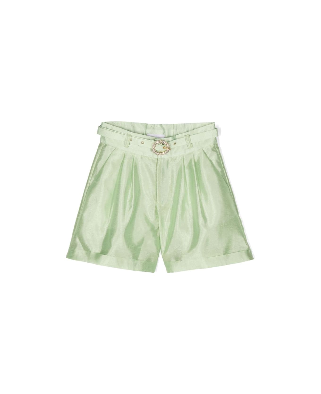 verde menta shantung design semi trasparente vita alta passanti cintura in vita regolabile e rimovibile fibbia con cristalli due tasche laterali oblique dettaglio a pieghe sul davanti orlo con risvolto chiusura con zip nascosta e bottone