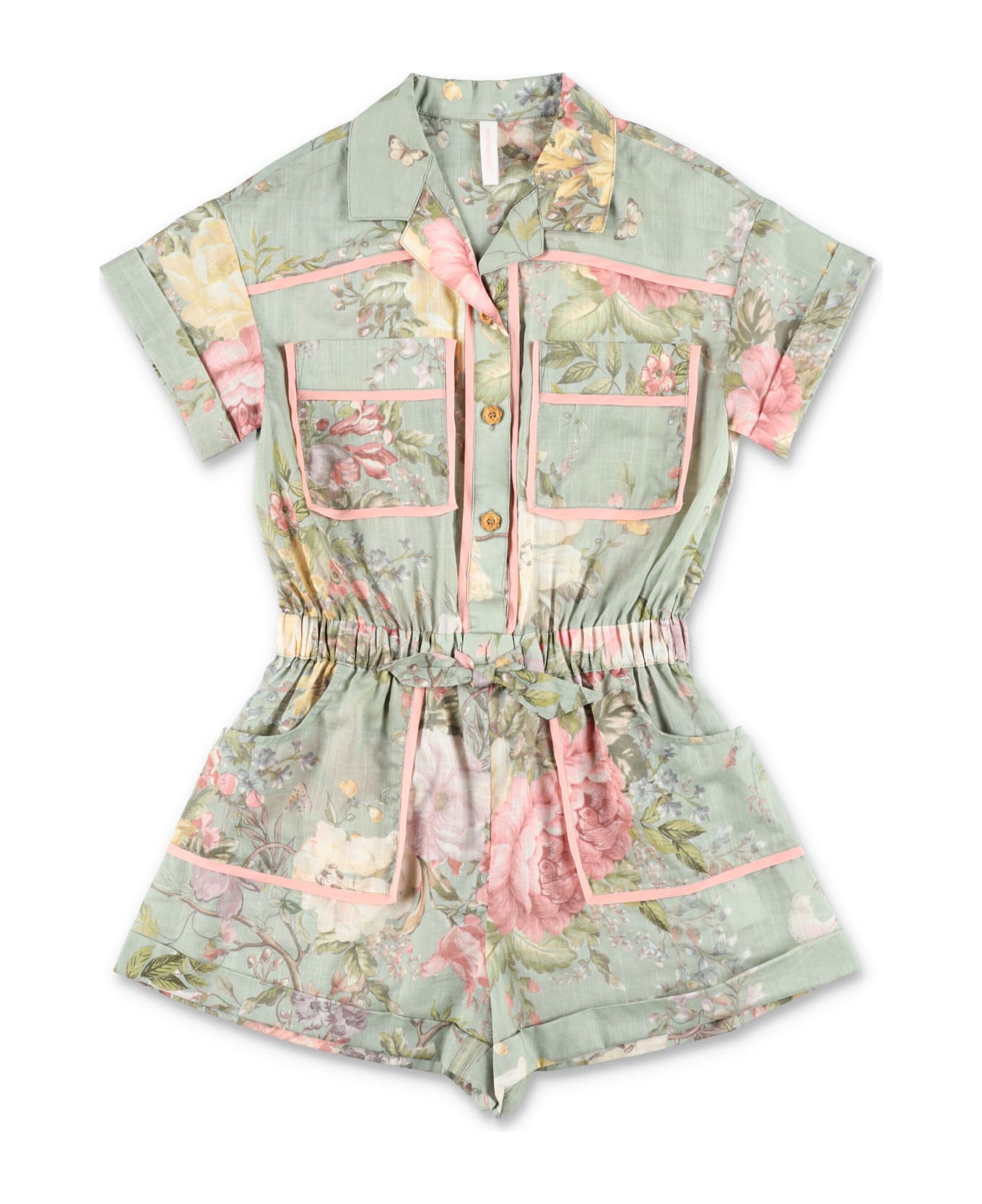 Waverly Playsuit By Zimmermann. Featuring: Cotton Toile Floral Print Classic Collar Short Sleeves Front Button Closure Front Pockets Elasticated Waist With Ties